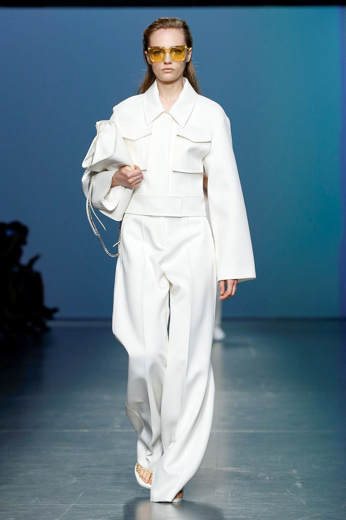 O macacão da Boss carrega traços do vestuário masculino, e apresenta cortes a laser como acabamento. Apesar do oversized, o look é minimalista e limpo.