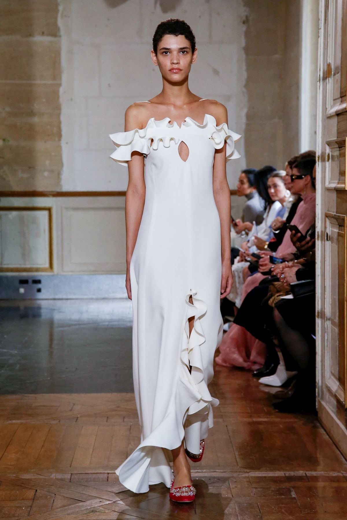 Seguindo o mood orgânico, os babados de Giambattista Valli são obras de arte, que aparecem como detalhes no longo all white. A fenda, que aparece levemente na altura dos joelhos, se une ao recorte oval no centro dos seios, adicionando sensualidade.