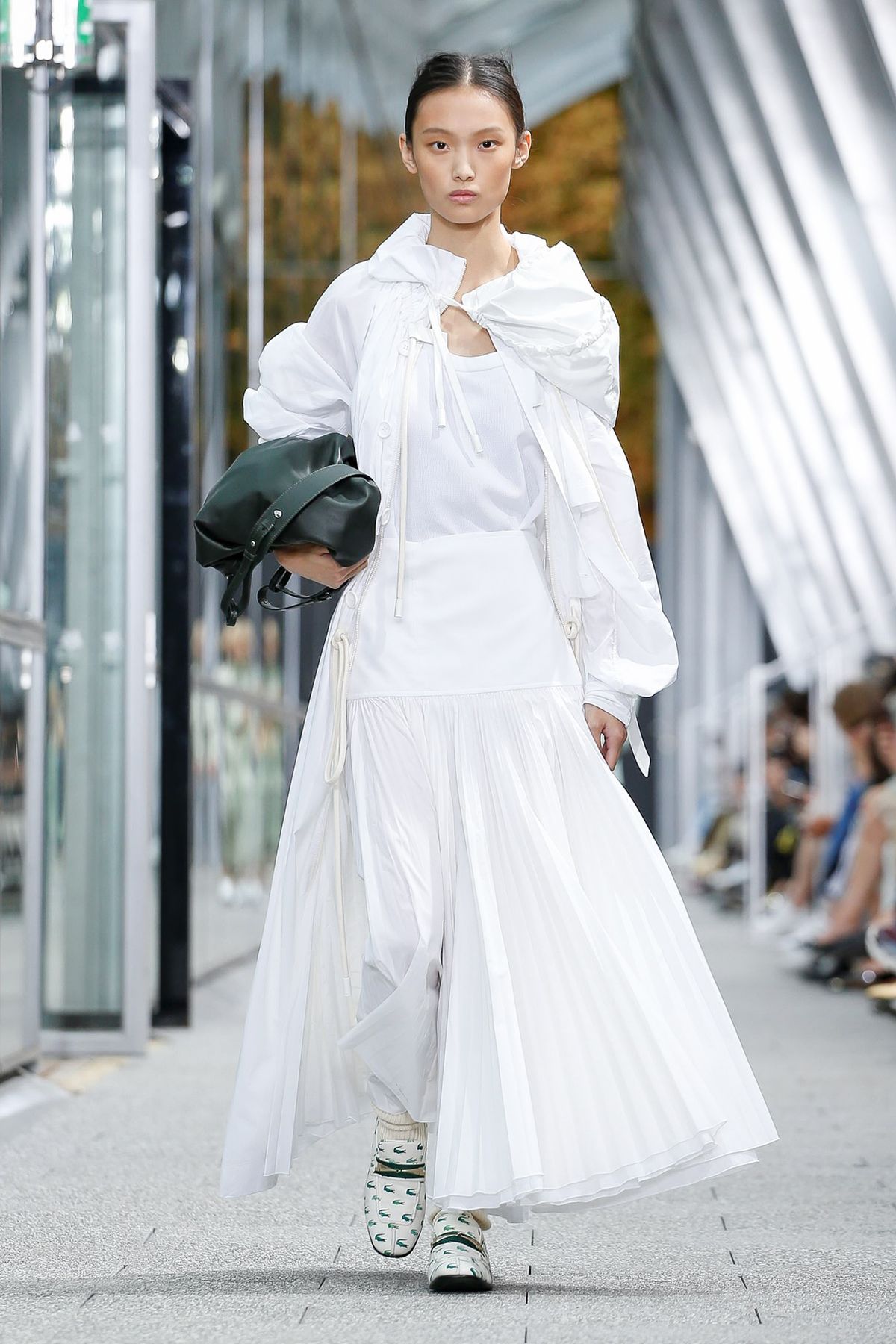 No melhor da elegância do mood esportivo, a Lacoste apresentou um verão 2020 extremamente elegante e repleto de informação de moda. Aqui, o casaco com capuz é acompanhado pela saia plissada, que adiciona o glamour necessário para a noiva subir ao altar.