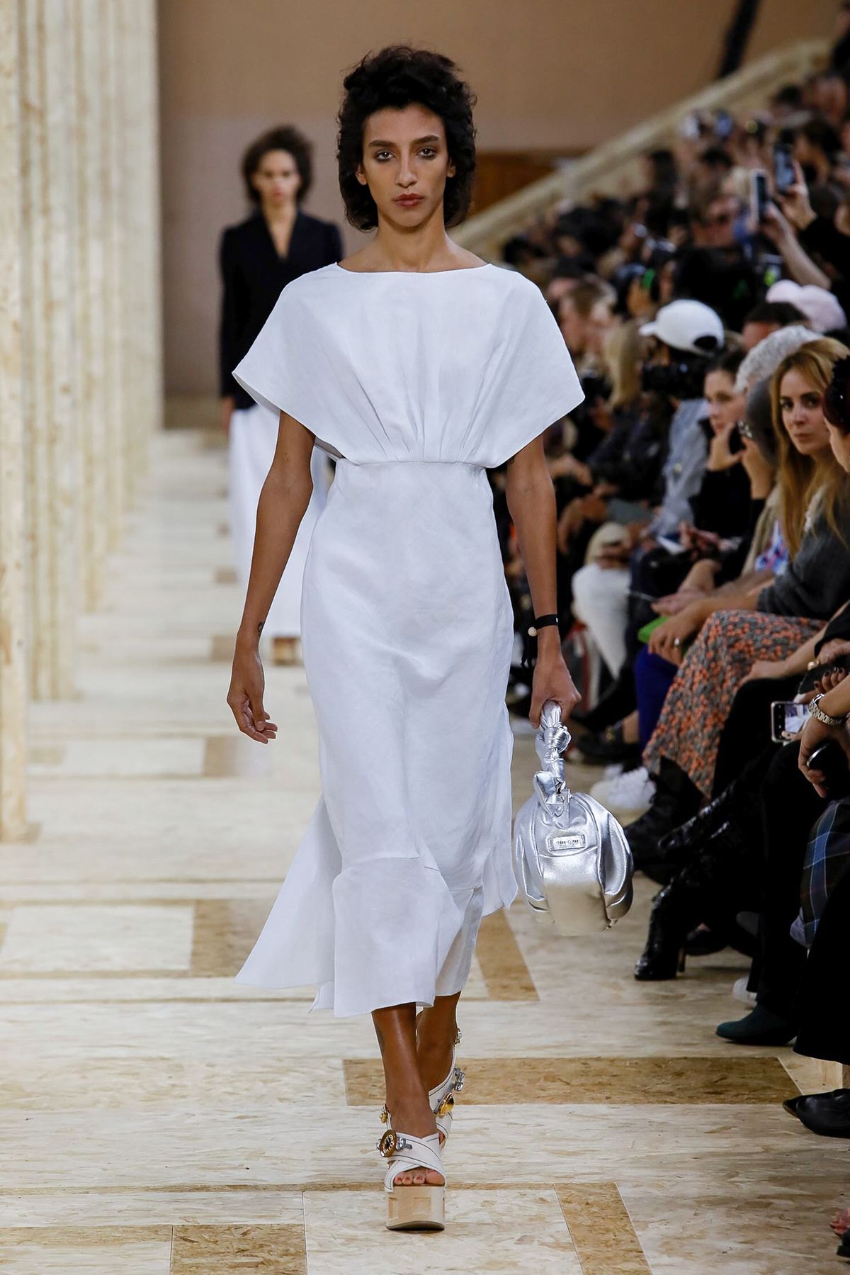 Já Miuccia Prada, que não deixou a assinatura da jovem Miu Miu de lado, elegeu inúmeros looks brancos para a passarela de seu verão 2020. Entre eles, o visual acima chamou a atenção: a simplicidade do estilo minimalista foi enriquecida pelos recortes, pelo tecido repuxado na cintura e pelo leve babado no final do vestido.