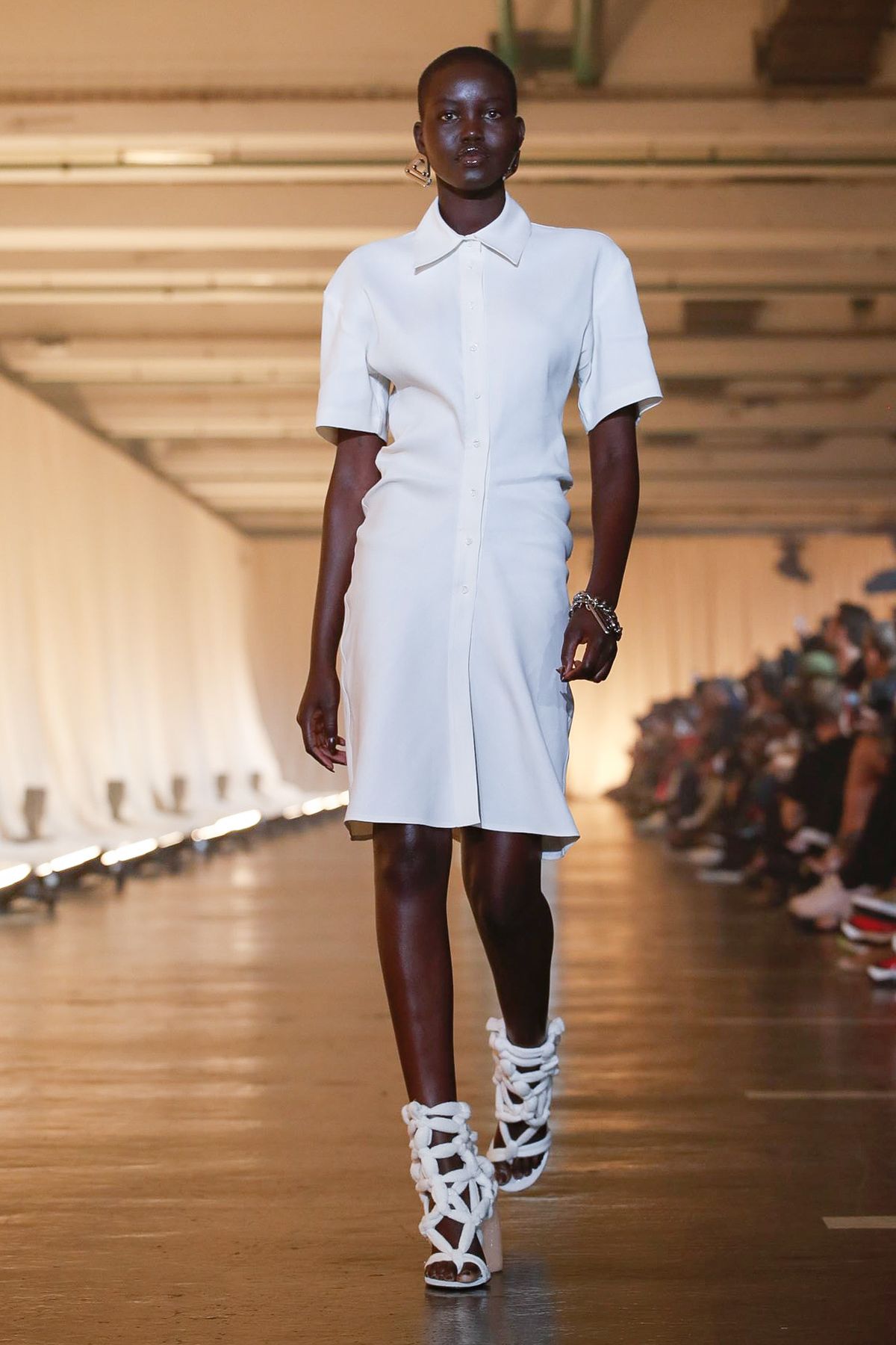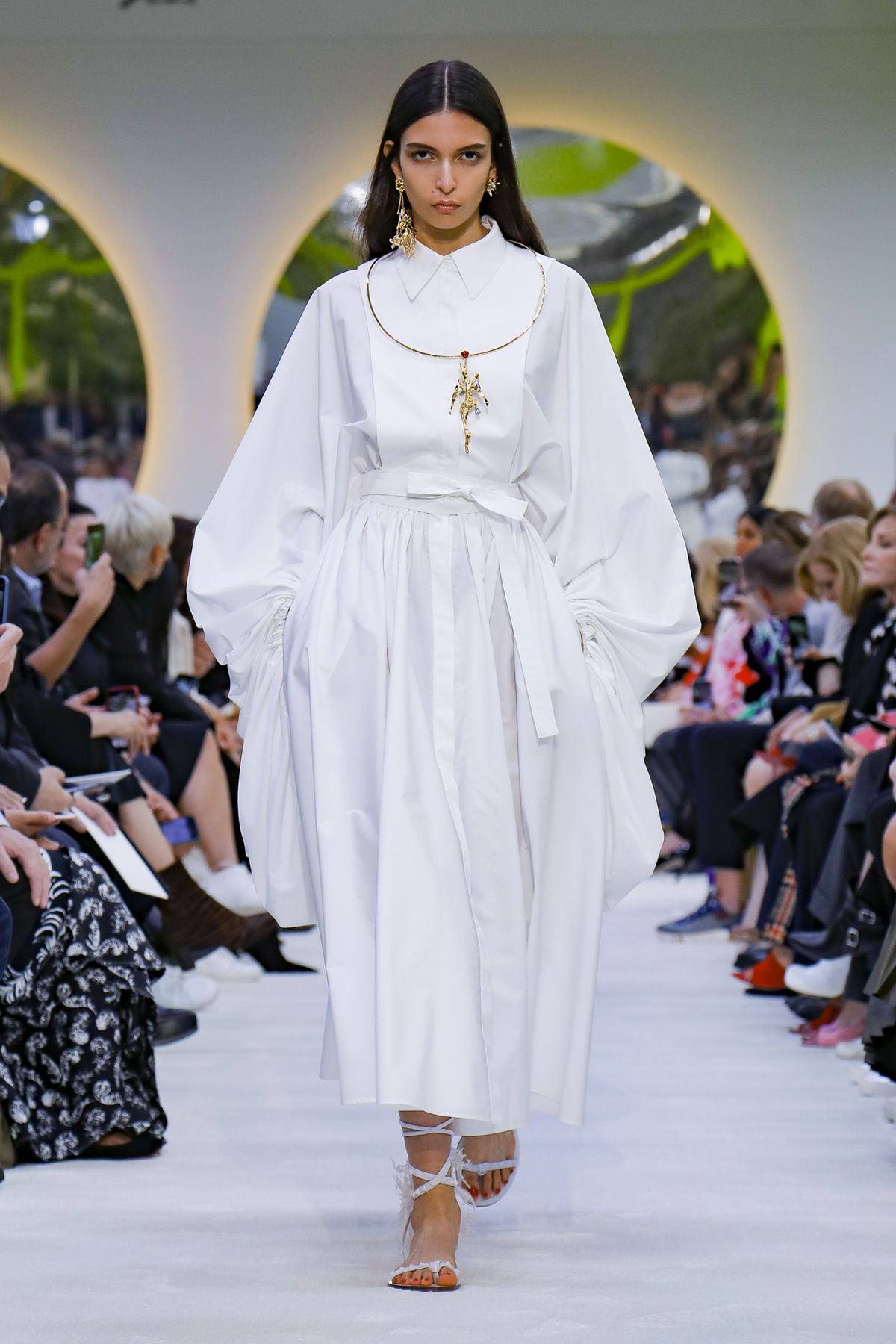 Adut Akech arrasou na passarela do verão 2020 da Off-White. A camisa com abotoamento central aparece como vestido, e faz a cabeça das millennials.