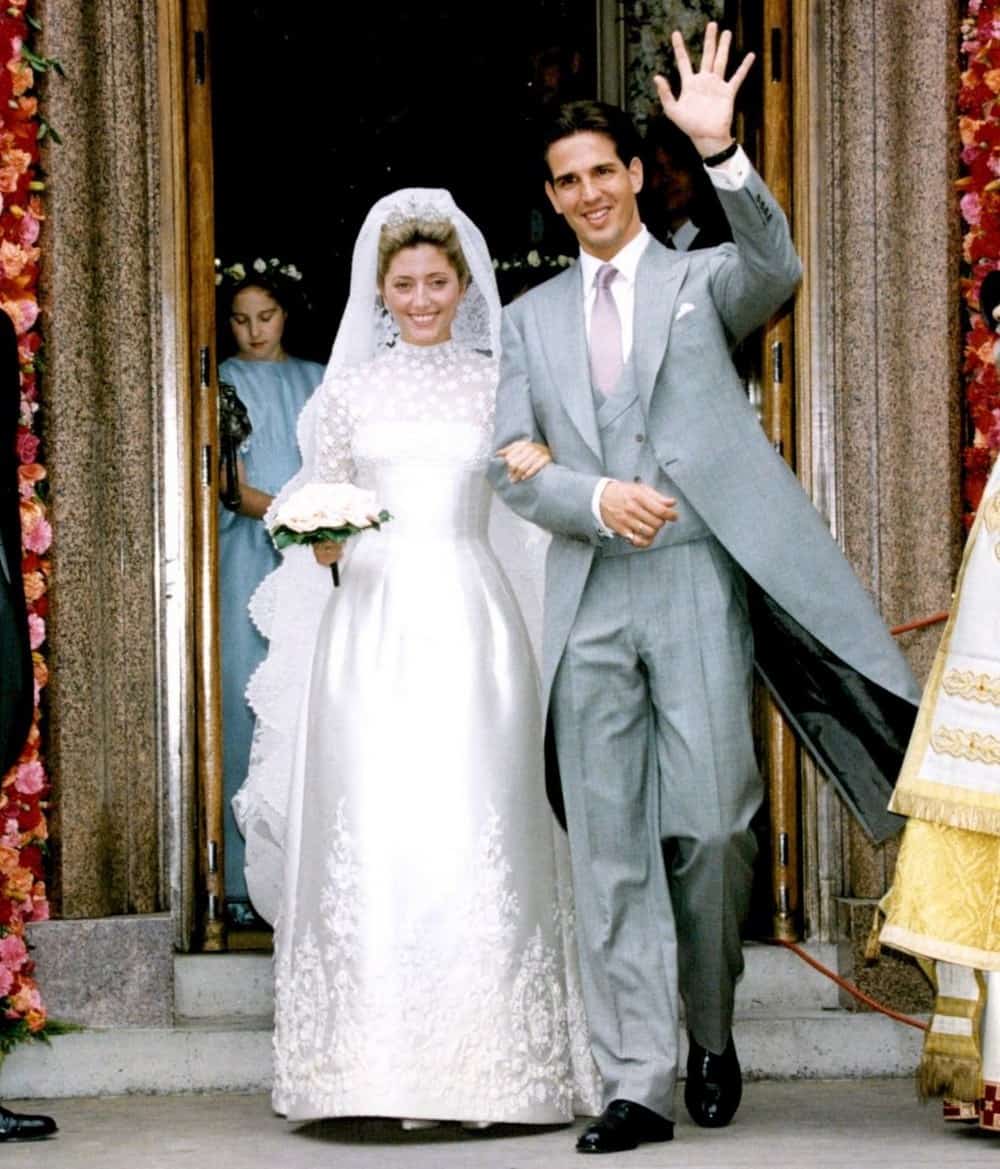 Marie-Chantal Miller, princesa da Grécia, se casou com o príncipe Pavlos em 1995. Ela usou um vestido de noiva personalizado da grife italiana Valentino que foi um sucesso. O vestido tradicional de manga longa era bordado com pérolas e tinha um véu de renda Chantilly. Foi necessária uma equipe de 25 pessoas para completá-lo.