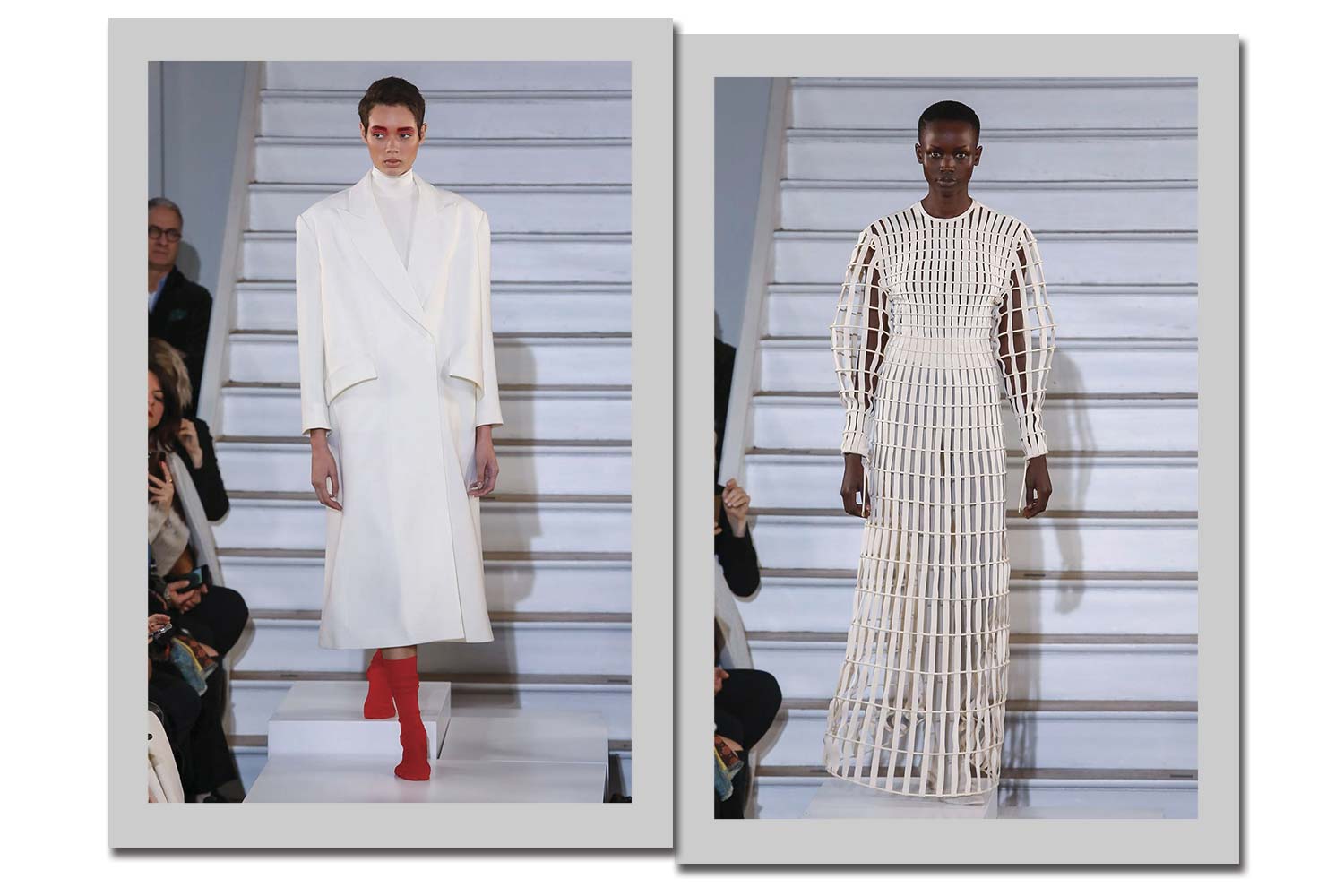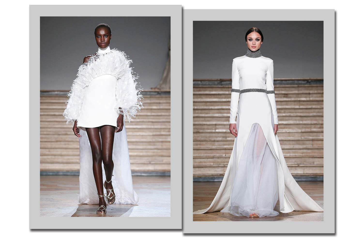 Outra marca que aposta nos contrastes é a Maison Rabih Kayrouz. À esquerda, um sobretudo de alfaiataria perfeito para se casar no inverno. À direita, um vestido muito delicado e vazado com corte a lazer que é uma verdadeira obra de arte.