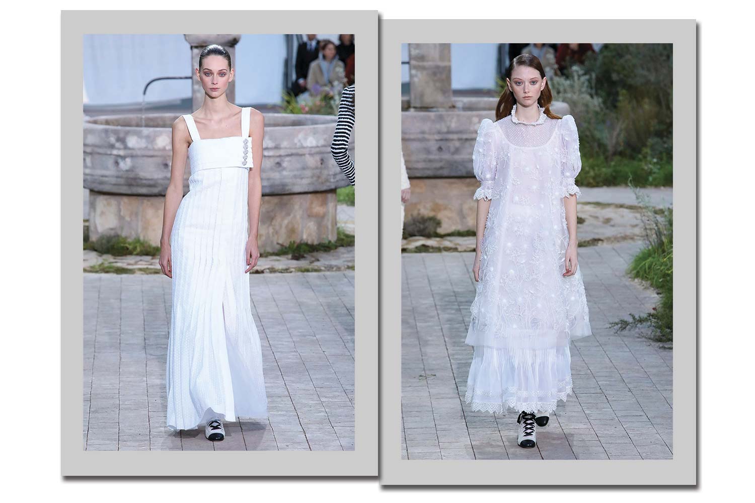 O desfile da Chanel foi totalmente minimalista e cheio de contrastes. À esquerda, um vestido simples de alça com pegada na alfaiataria. O look da direita é totalmente diferente, romântico, com mangas bufantes, babados e detalhes de flores no tecido transparente.