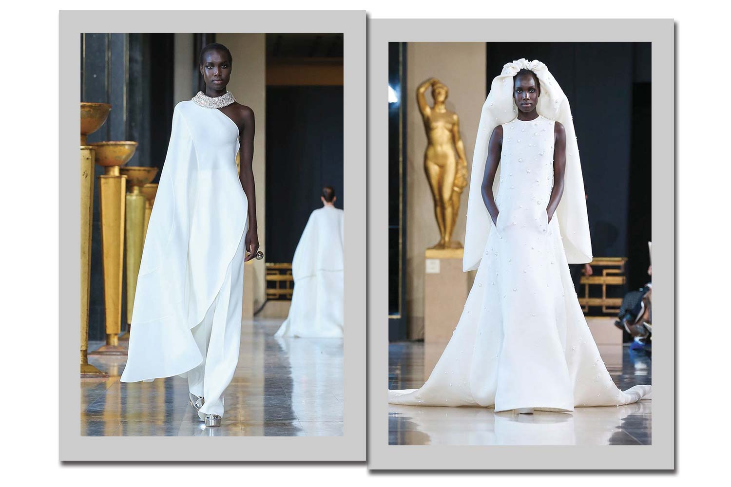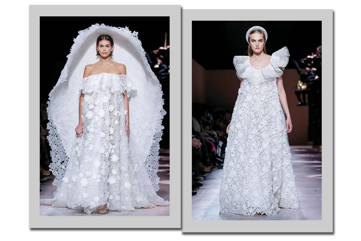 A Givenchy carrega no volume – quanto maior, melhor. À esquerda, Kaia Gerber mostra um véu totalmente inovador, estruturado, que “abraça” a noiva. À direita, outro modelo amplo e com babados na gola.