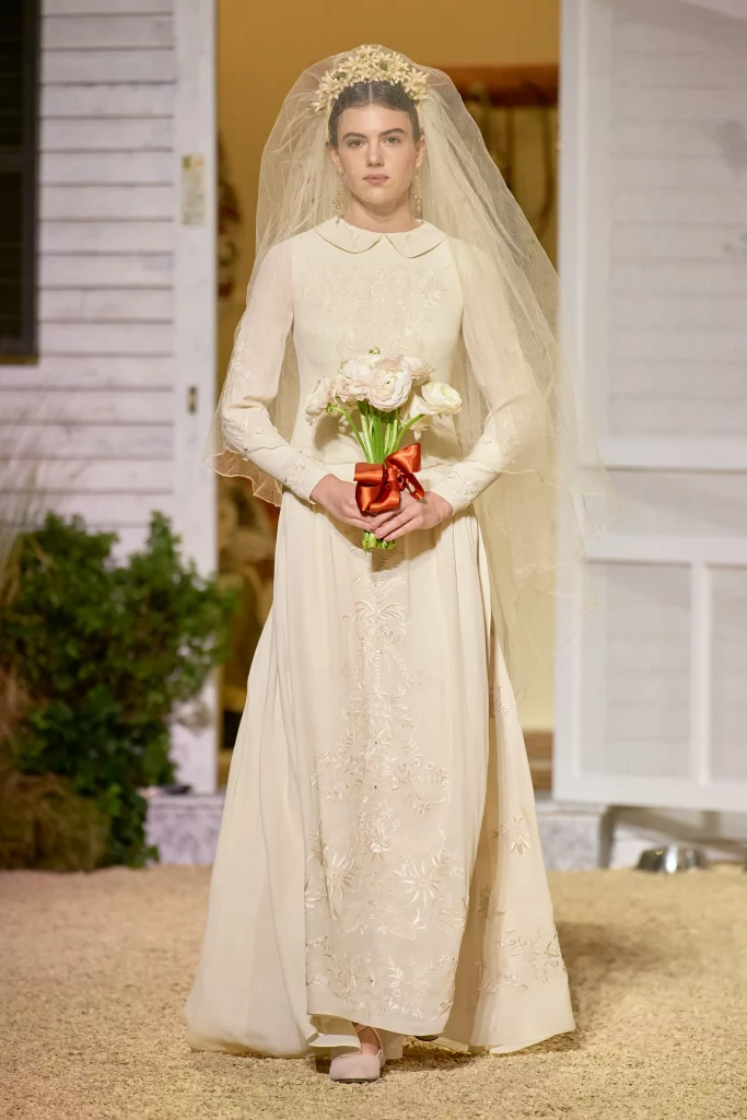 A novinha do select, criada em 2019, em Berlim, seguiu na dianteira do mercado, evidenciando o uso de materiais reaproveitados, o sistema de produção sustentável e os caimentos agêneros. A designer Rosa Marga Dahl é o nome que dá sustância à SF1OG e, que, nesta temporada, brincou com a memória afetiva para elaborar os looks da série “Artifact”. Para ela, a noiva tem que ser “o menos noiva possível”. Uma saia curtinha faz dupla com a jaqueta de couro off-white, ambas decoradas com penachos. Se achou moderno demais para atravessar a nave, a dica é focar na ex-Spice Girls Victoria Beckham, adepta do vintage, com o mínimo de ornamentos à vista. Dessa vez, a estilista apostou nas modelagens que abraçam os contornos femininos, com toques de sensualidade, texturas acetinadas, comprimentos longos e sandálias plataformas.