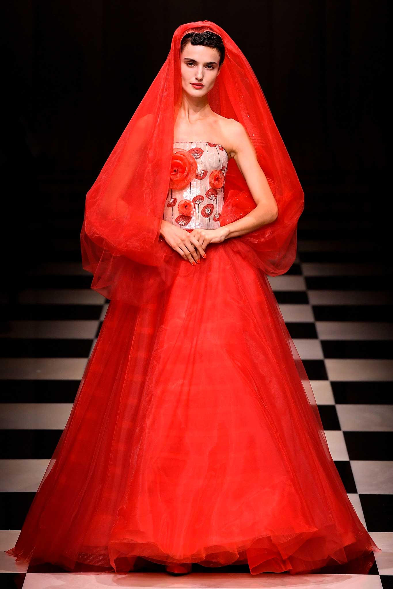 Giorgio Armani, por exemplo, fez uma ode às rosas em sua nova coleção, pintando sua noiva de vermelho, com apliques florais em 3D e paetês no top coseletado – um luxo!