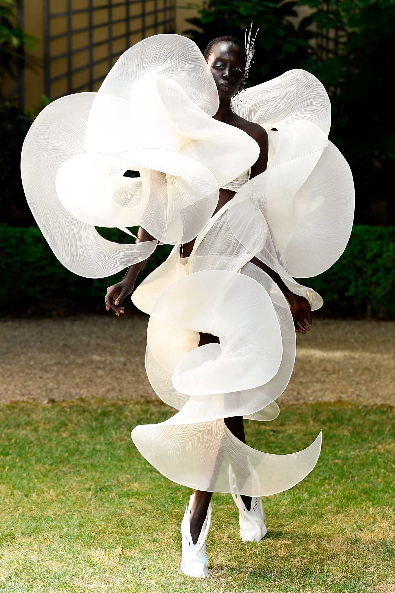 Mais ousada, a holandesa Iris van Herpen fez vestidos de noiva que desafiam a gravidade, com ondas mirabolantes em camadas, ou penas que se posicionam como verdadeiras esculturas.