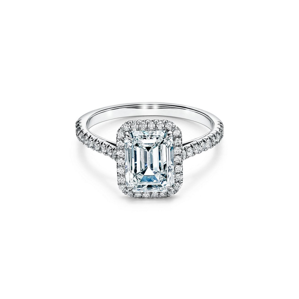 6 / 6Anel de noivado Halo Tiffany Soleste com lapidação esmeralda e aro em platina com diamantes – R$187.000,00