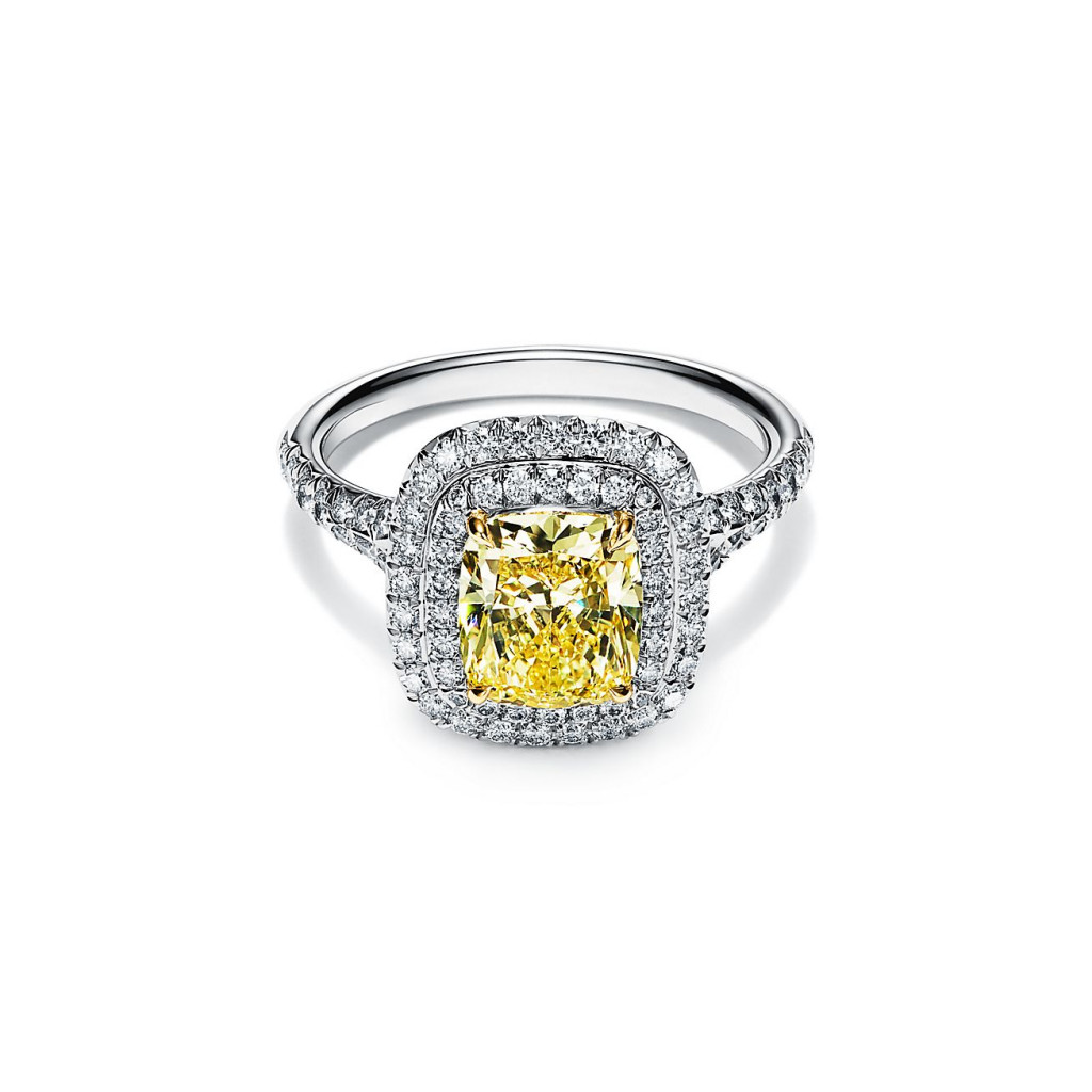 1 / 6Anel de noivado Halo Tiffany Soleste em platina com diamante amarelo em lapidação cushion – R$607.000