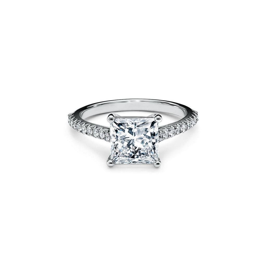 4 / 6Anel de noivado Tiffany Novo™ com lapidação princesa e aro em platina com pavé de diamantes – R$108.000,00