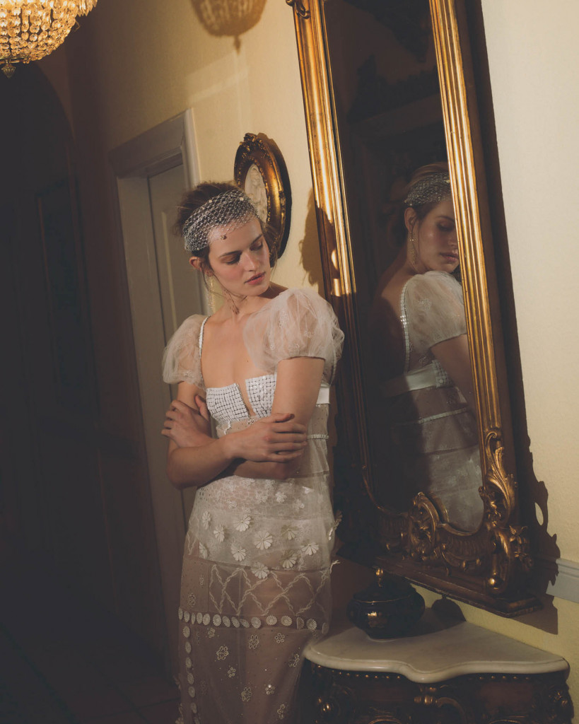 2 / 4Vestido Laure de Sagazan, headpiece Beretkah, brincos Juvelan e sapatos Aquazurra | Foto: Karolina Woznicka