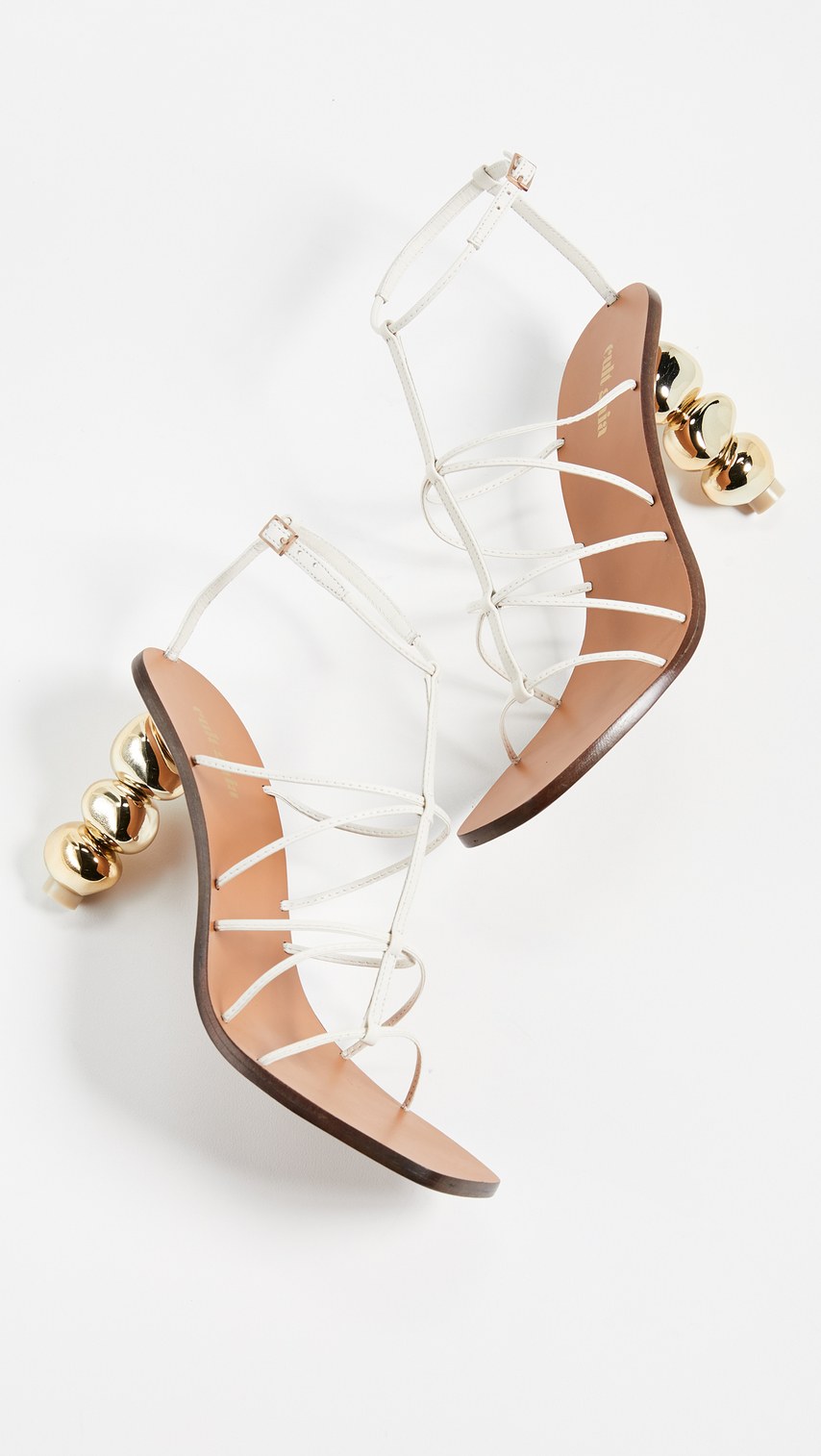 Para arrasar no glamour, o dourado é sempre bem-vindo. O salto construído com três bolas possui tiras brancas em todo o corpo do sapato para equilibrar os detalhes.