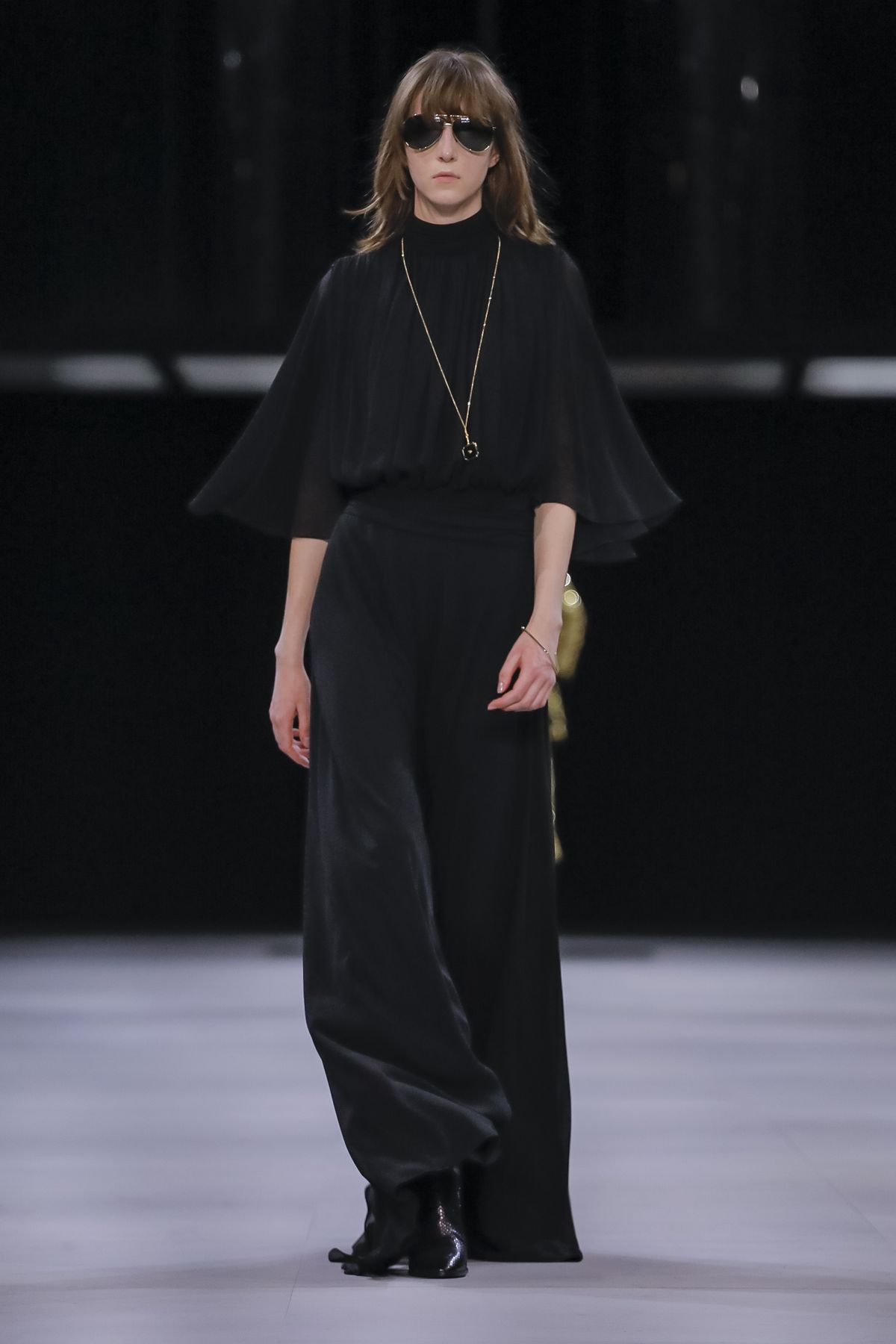 Uma tendência que apareceu bastante na PFW e funciona para qualquer madrinha é a gola alta. Principalmente no inverno, o decote escolhido pela Celine adiciona elegância e modernidade ao visual.
