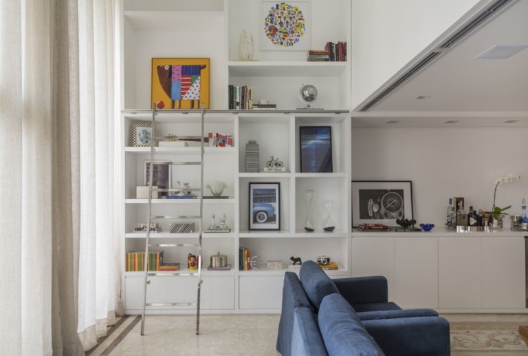 Por sinal, a marcenaria foi elaborada para garantir a identidade de cada ambiente, caso do aparador do bar do living, que emenda com a grande estante de pé-direito duplo, assim como home theater e a sala da lareira, que foram revestidos com painéis de madeira deixando o ambiente mais aconchegante. O hall de entrada também ganhou painéis de madeira ripada.