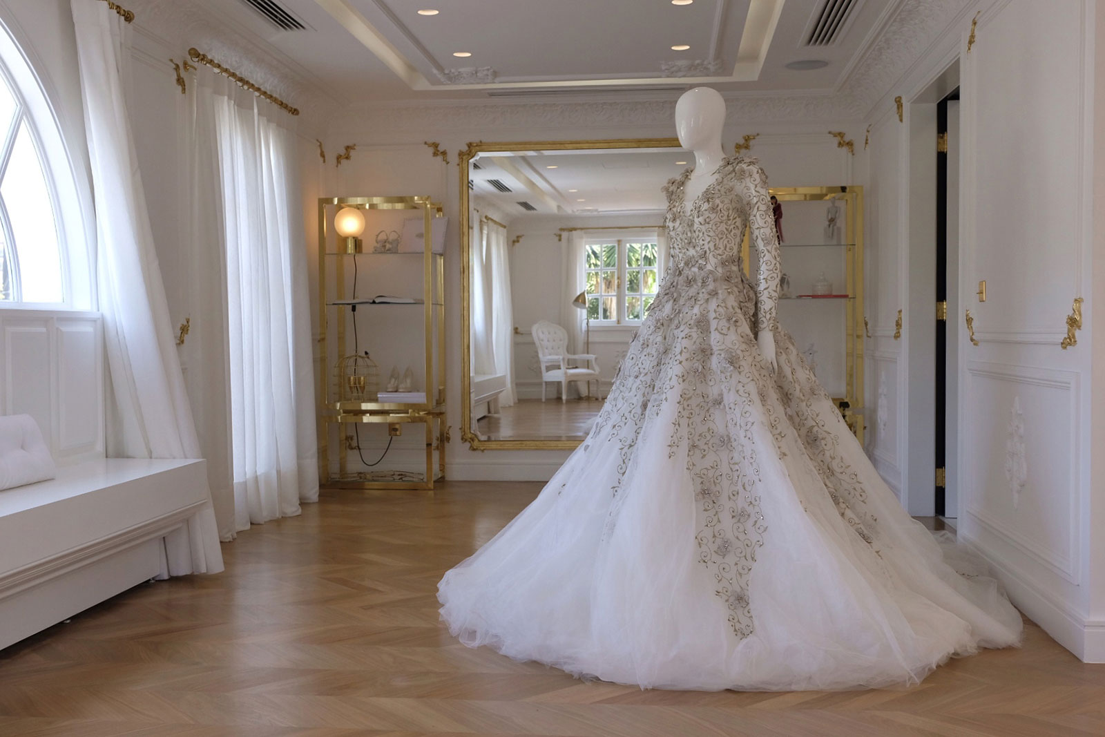 Elas têm ao seu dispor um espaço relax, passando pela sala de maquiagem e a ampla e luminosa sala de provas, onde o branco e o ouro se destacam. É aqui que a cliente pode usufruir de uma massagem ou de uma seção de aromaterapia ou até mesmo marcar um “get together” com as amigas e familiares.