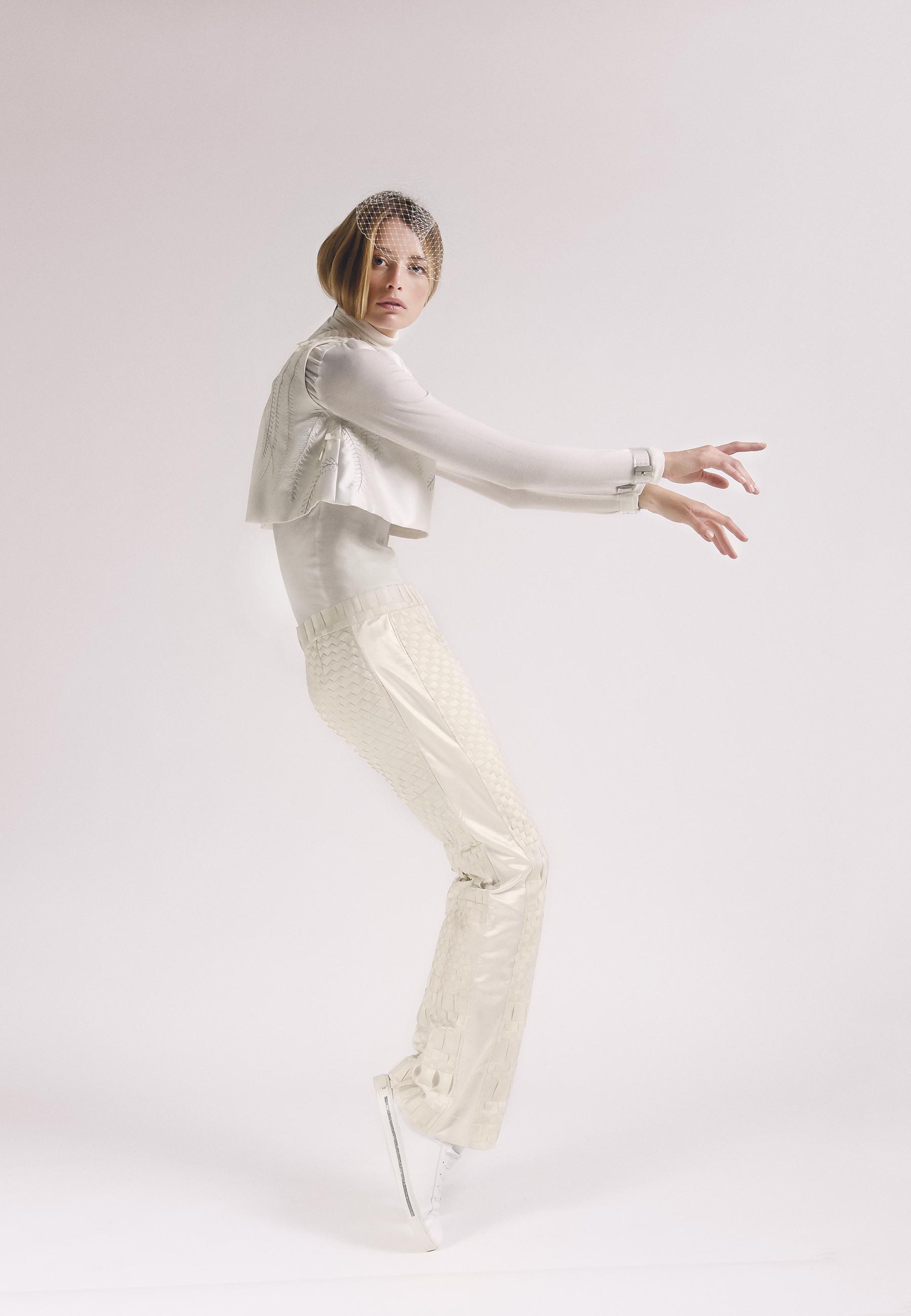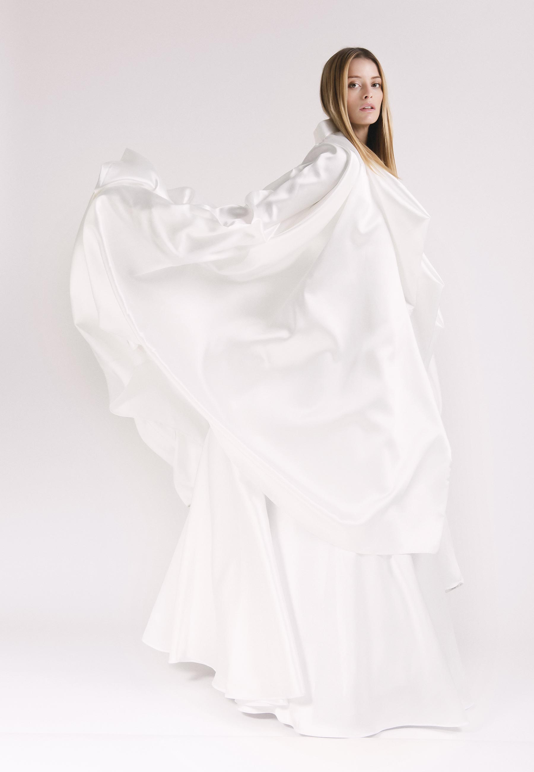 Flavia Lucini de vestido e sobressaia usada como capa, ambos de cetim de seda, Solaine Piccoli.