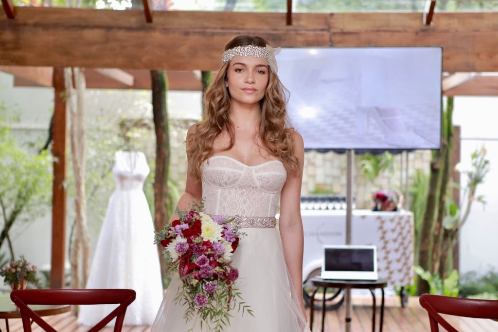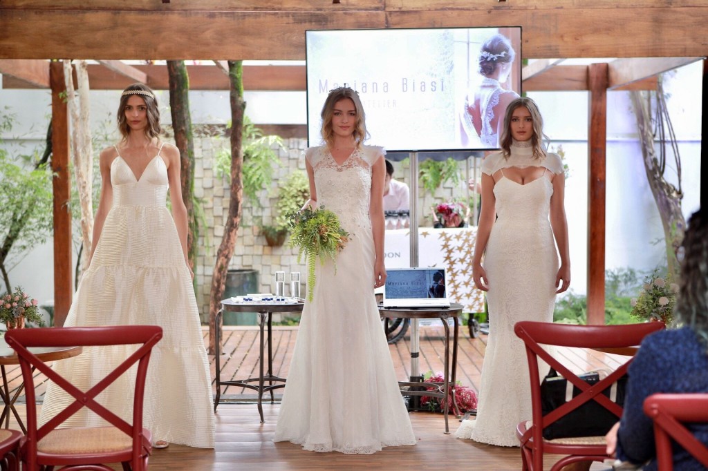A estilista Mariana Biasi apresentou alguns de seus modelos de vestidos que destacam toda a paixão e a elegância traduzida na vanguarda romântica para noivas. Ela contou com a colaboração da beauty artist Claudia Abrahão, que se encarregou de dar o toque sofisticado aos penteados das tops.