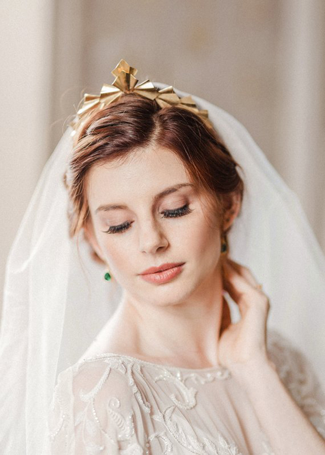 A grinalda da Etsy garante modernidade e informação de moda ao look da noiva. O desenho único da tiara dourada enriquece o visual.