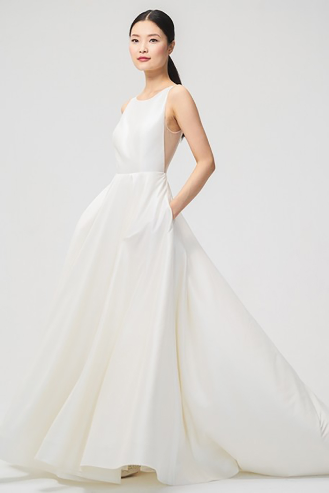 Na vibe “clean and simple”, onde a modelagem do vestido é quem carrega o estilo, os bolsos só enriquecem. Neste caso do modelo de Monique Lhuillier, o laço nas costas arremata o visual.