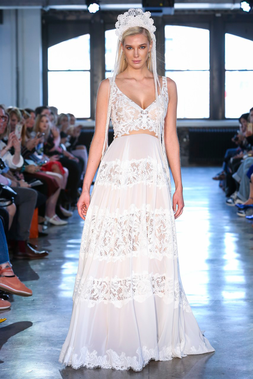 Mas as noivas mais ousadinhas podem fugir do tradicional slip dress longo e investir na barriguinha de fora. Está em dúvida? Pois a trend reinou nas coleções apresentadas durante a edição 2018 da Bridal Week, principal semana de moda de noivas do mundo, que acontece em Nova York.