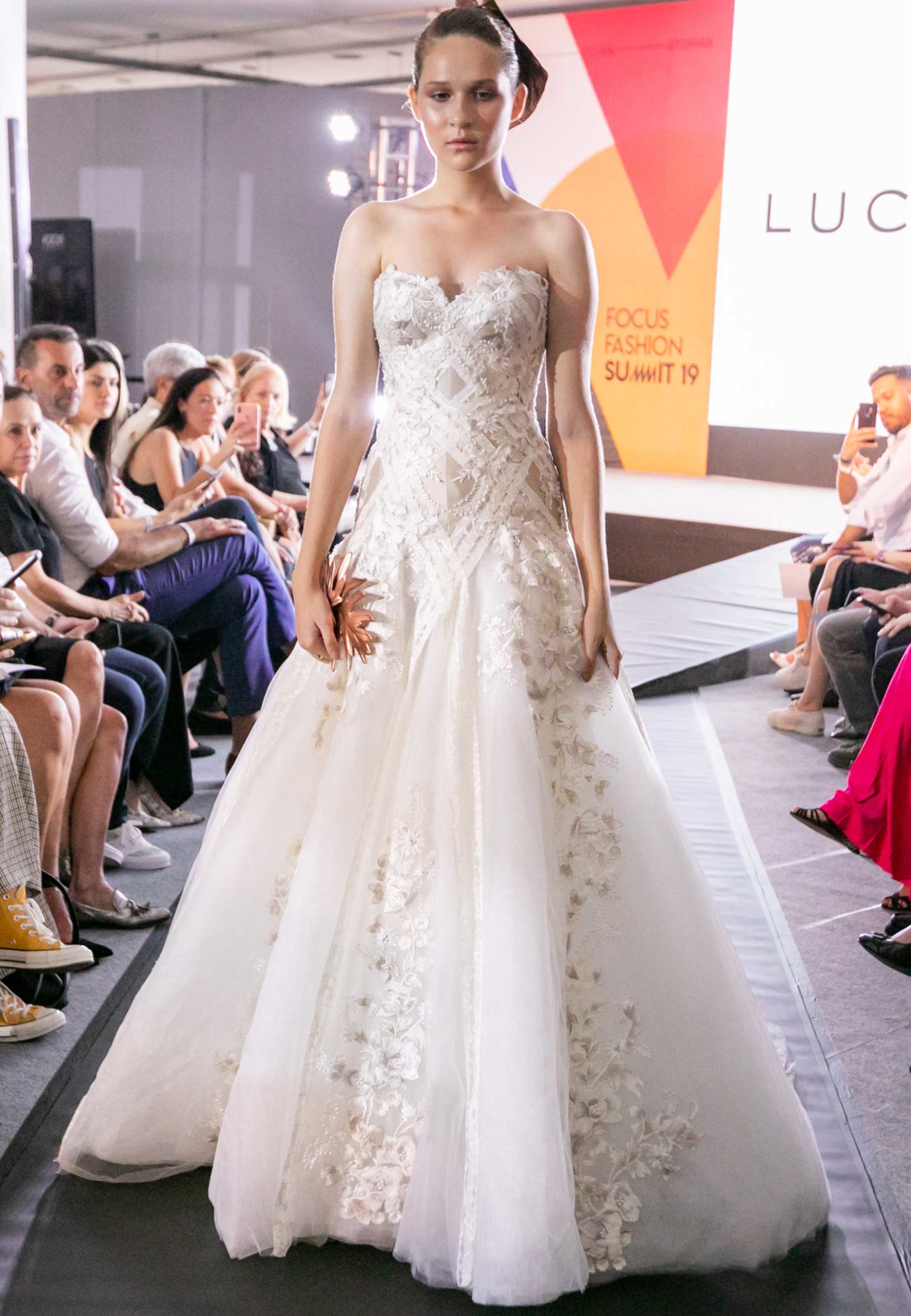 Entre as apostas do designer estão os vestidos volumosos estruturado em contraste com modelagens enxutas e fluidas, decote tomara que caia, texturas com flores e rendas em 3D, além de relevos abstratos.