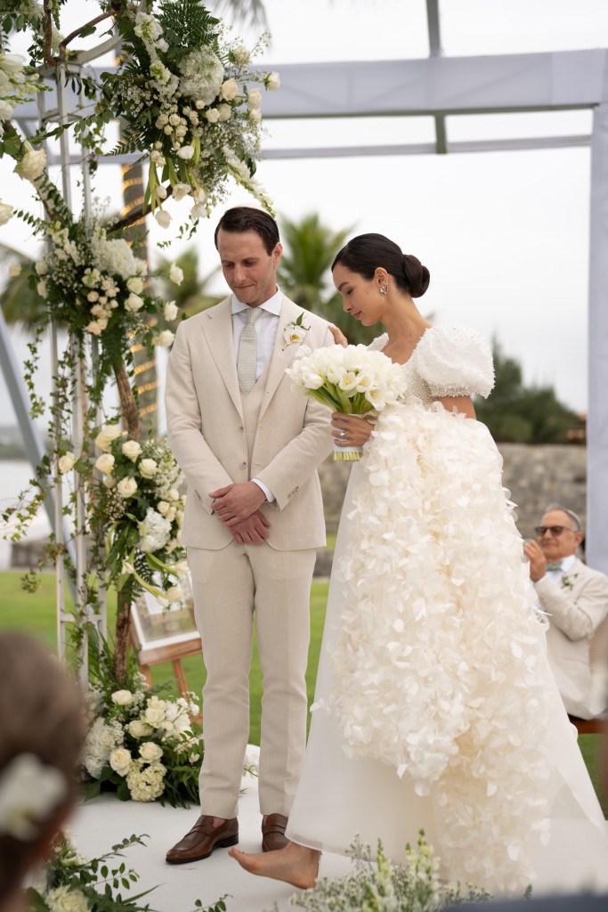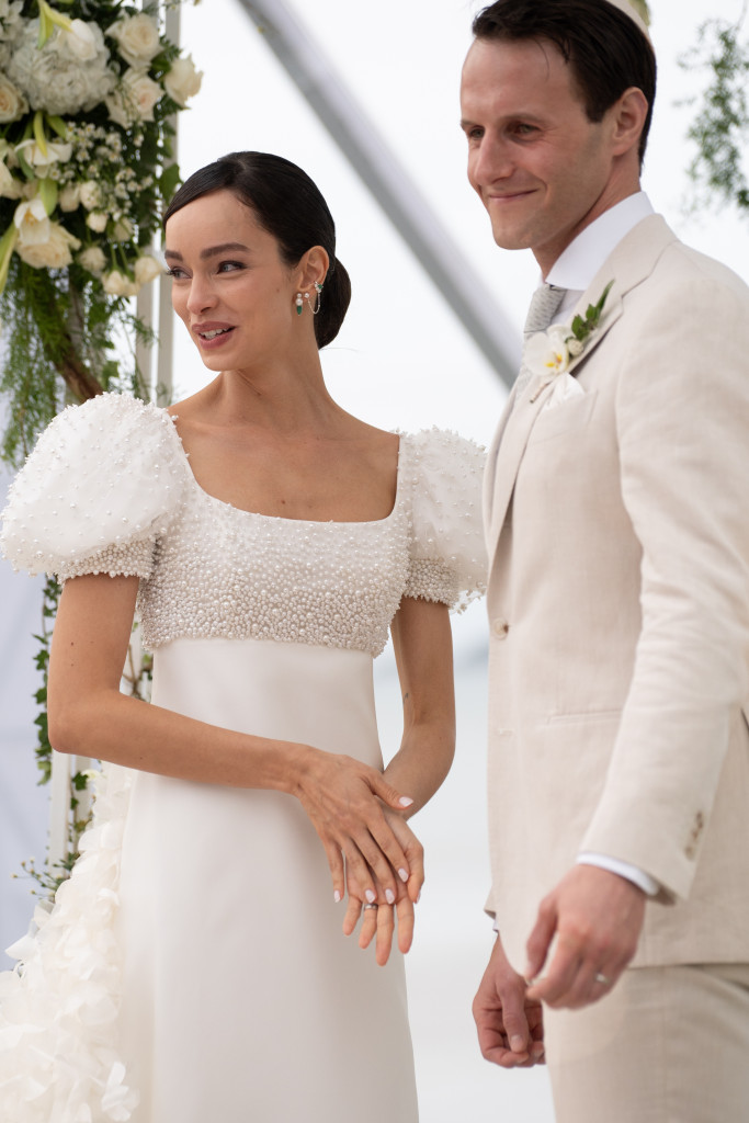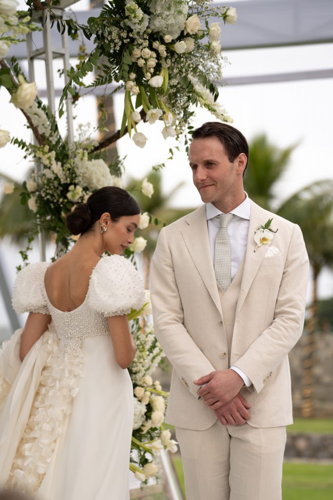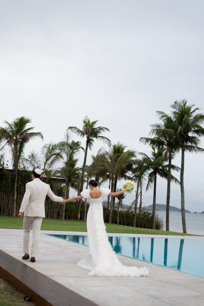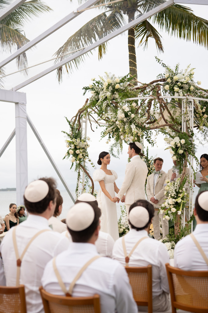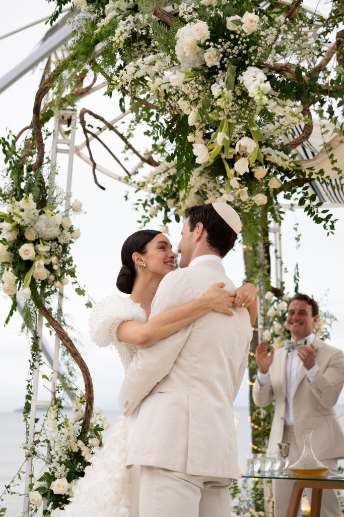 A celebração seguiu a tradição judaica e foi dividido em duas partes: pela manhã, os noivos assinaram a Ketubah, um documento judaico essencial para o casamento, na presença de familiares, madrinhas e padrinhos. Em seguida, houve a cerimônia ao ar livre sob o chuppah, um tipo de tenda que simboliza o novo lar que os noivos estão construindo juntos.