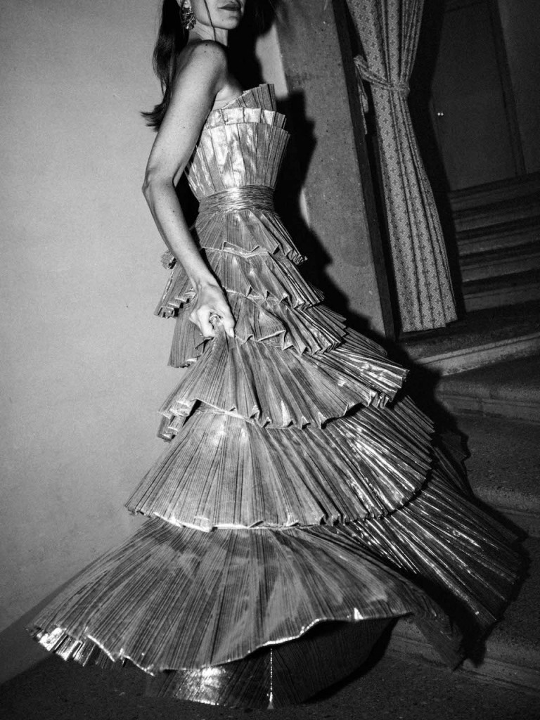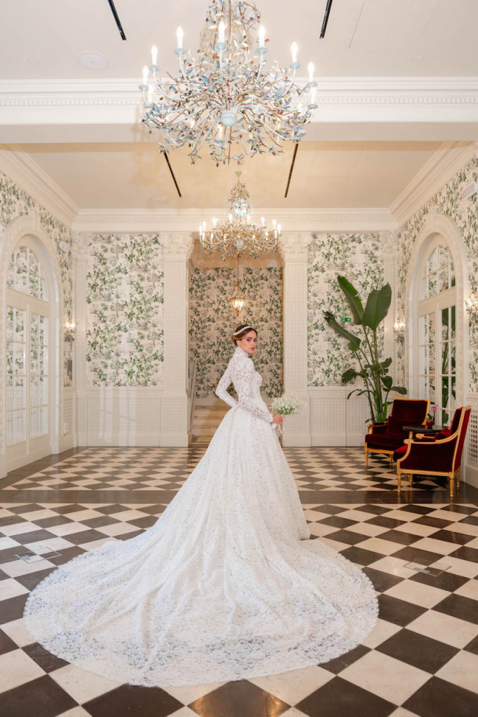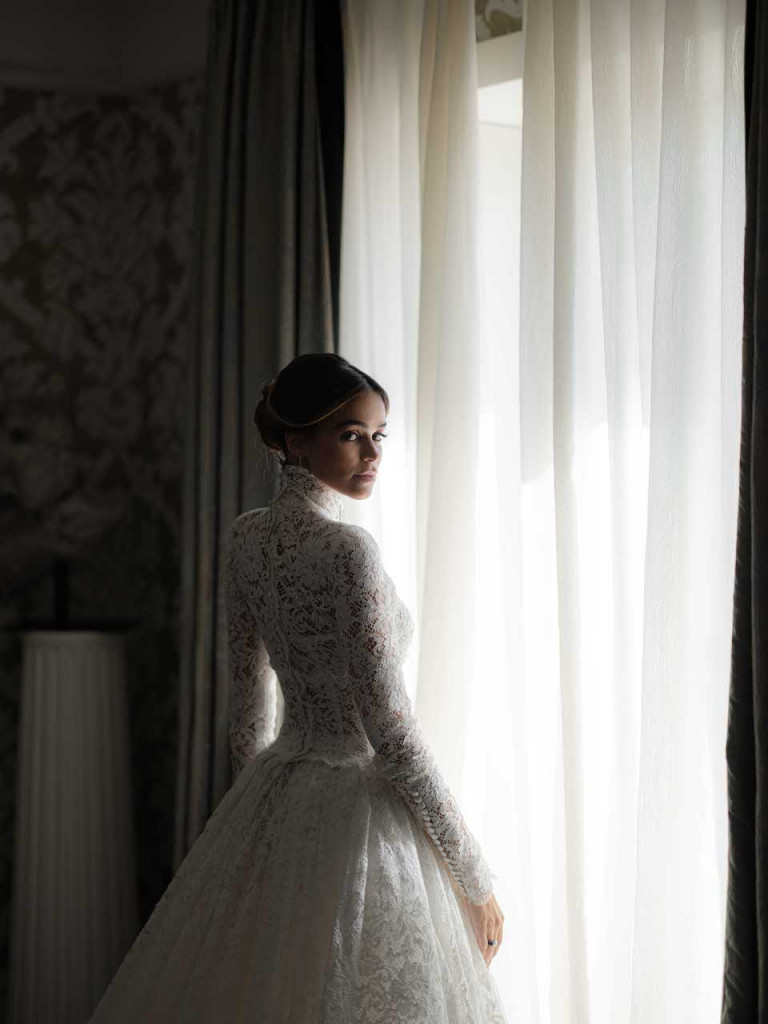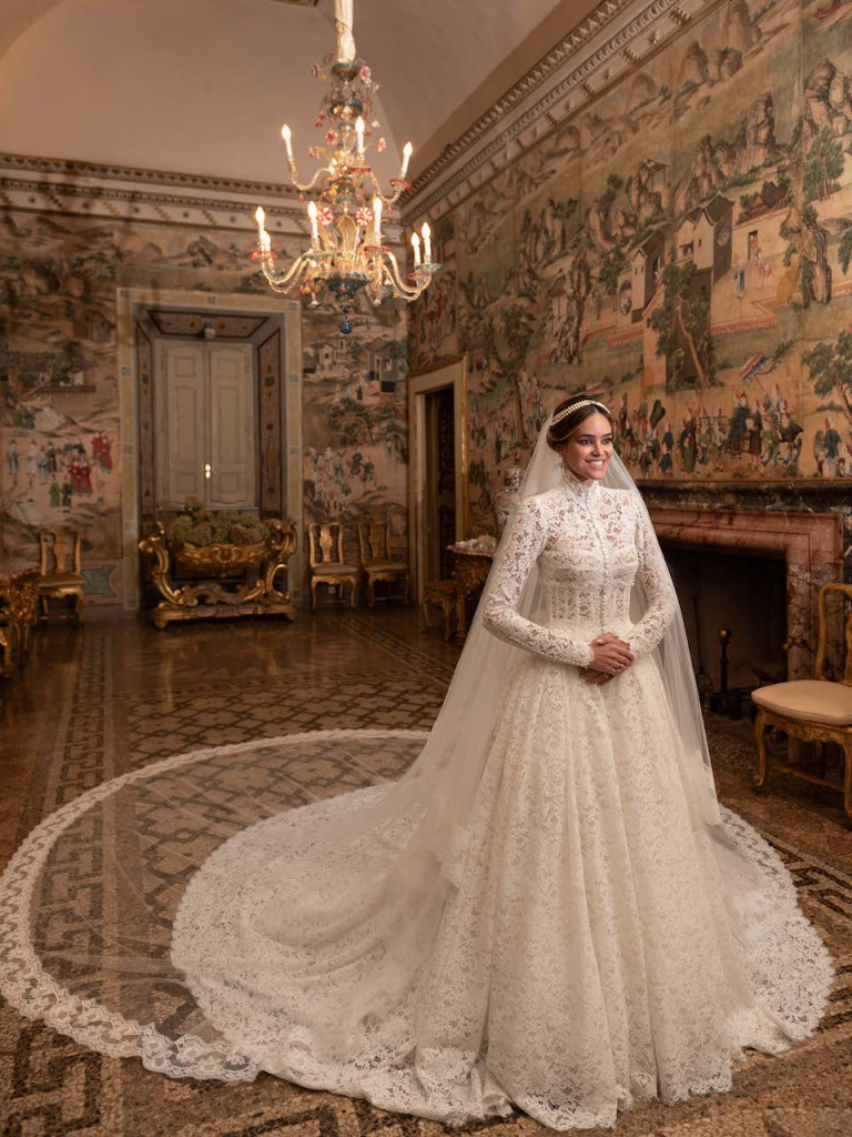 O vestido também tem a Itália no DNA e foi assinado pelos estilistas Domenico Dolce e Stefano Gabbana. O processo de desenvolvimento da peça foi feito a seis mãos e envolveu seis visitas ao ateliê de alta-moda da Dolce & Gabbana. “Quando cheguei lá, eles pediram para que eu desenhasse o vestido que eu queria, já que eu sou estilista, e aí eles foram propondo as ideias deles, que tornaram o vestido ainda mais incrível. Foi uma experiência muito especial”, conta Sabine. Os estilistas, inclusive, levaram o vestido em mãos de Milão para Roma e foram responsáveis por vestir a noiva para subir ao altar.