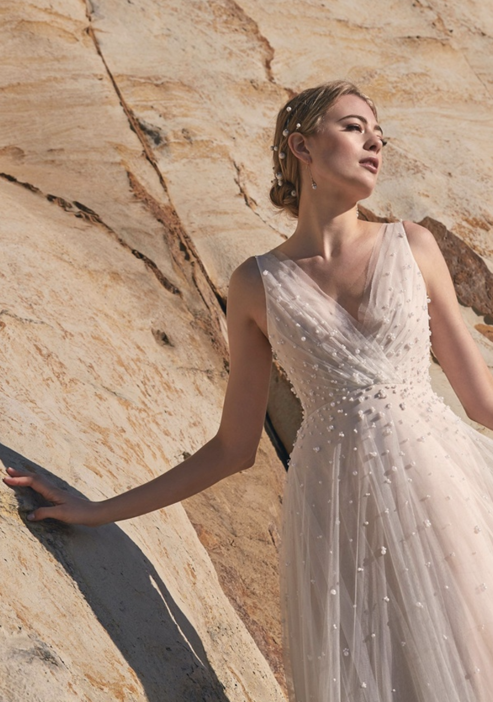 Focar o detalhe da pérola bordada em um ponto do vestido também é válido. Assim, o detalhe se torna quase um acessório.