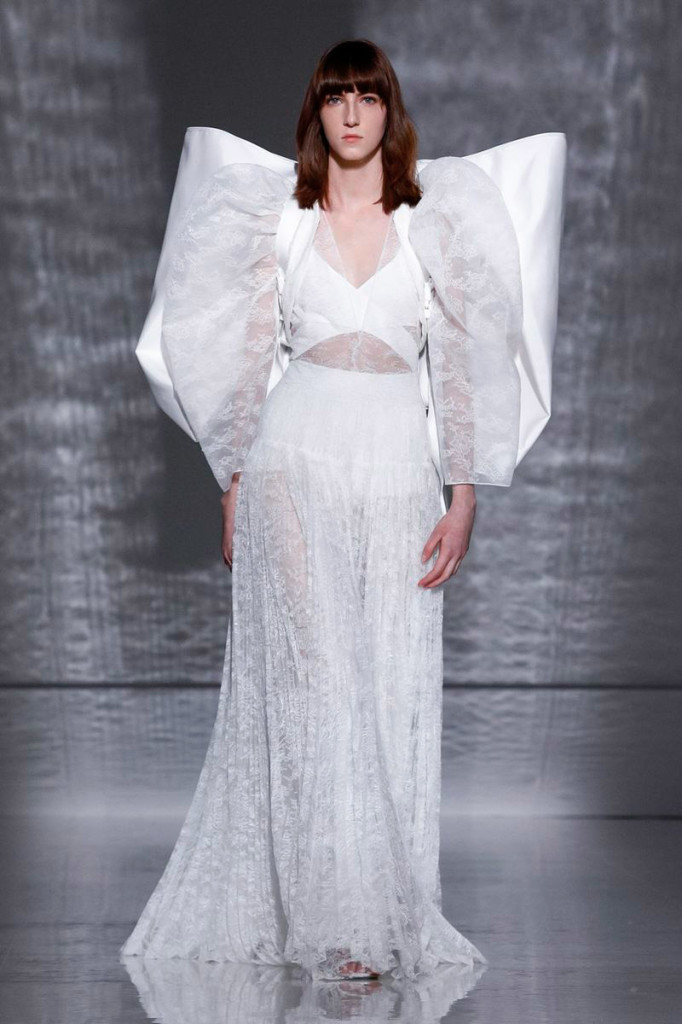 O plissado alongou ainda mais o visual da modelo na passarela da Givenchy. A leve transparência também é uma opção para as noivas mais ousadas.