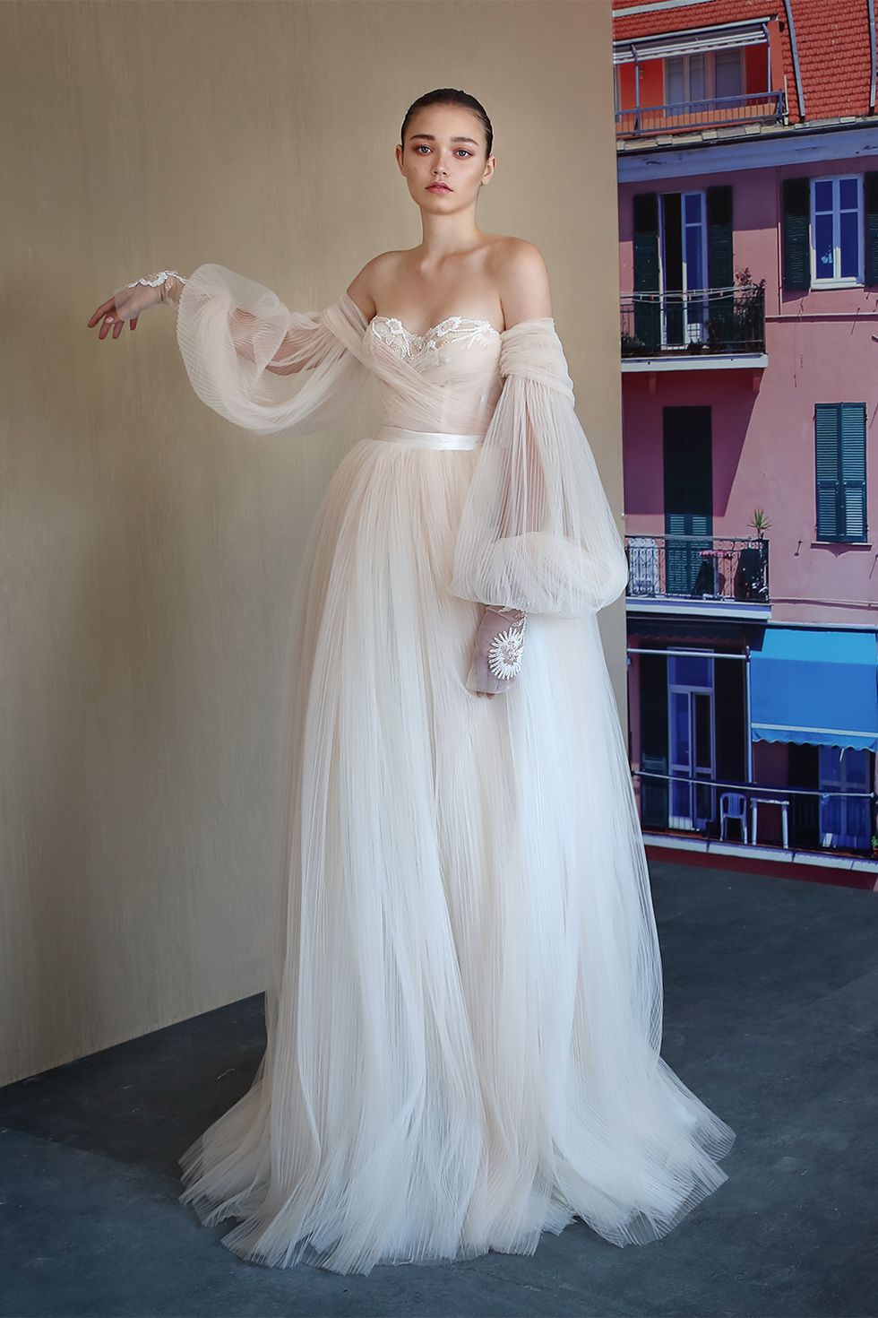 Galia Lahav usou o plissado para armar ainda mais as mangas bufantes do modelo. A saia volumosa também foi enriquecida com o estilo.