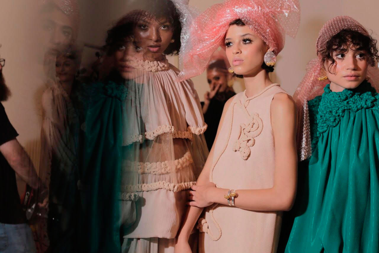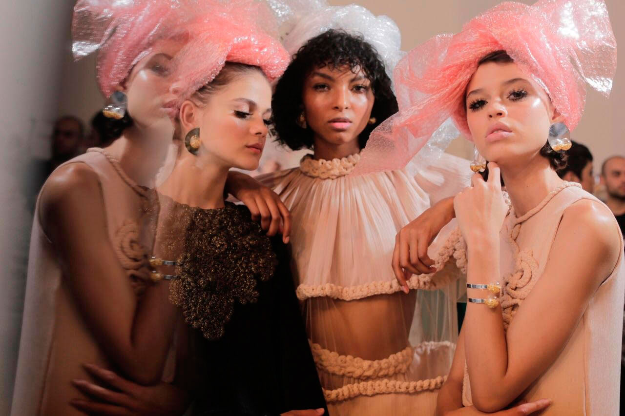 O plástico bolha também apareceu em outros looks, sempre adorando cabeças, em belos laços e turbantes.