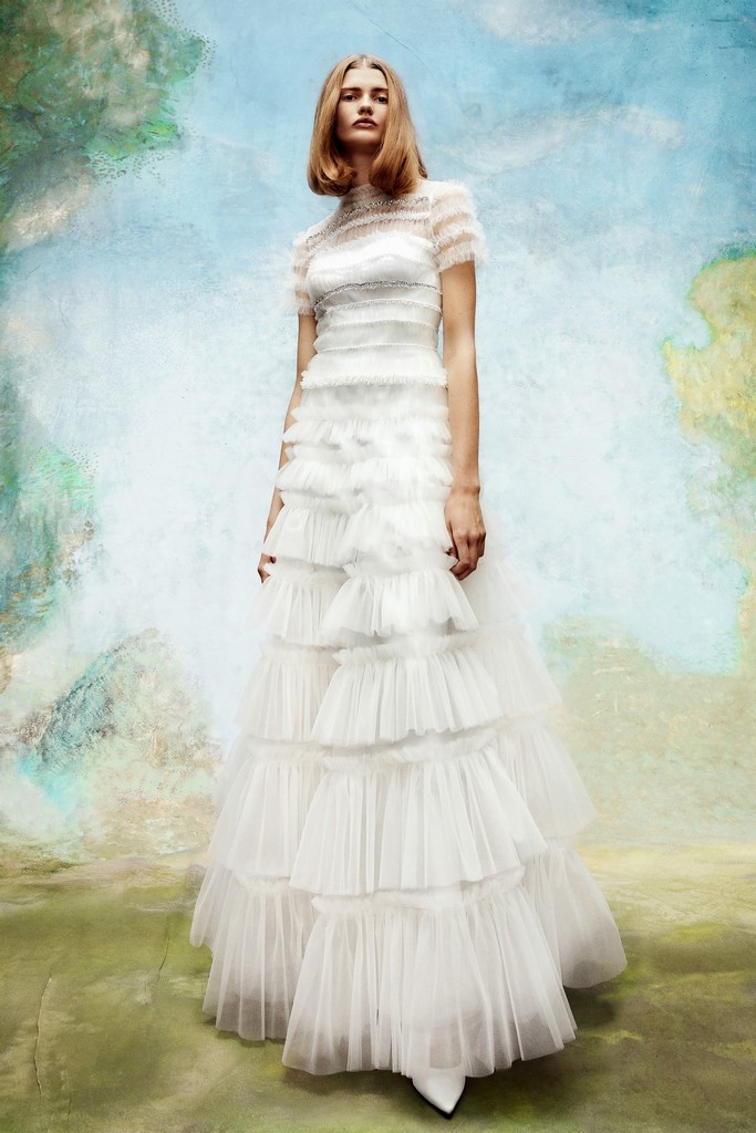 Outro detalhe simples que pode modernizar qualquer look bridal são as golas altas. Na nova coleção da Viktor & Rolf, elas apareceram em diferentes tipos de vestidos. Na peça mais curta, a gola – e o bolso – contrastam com os babados e aplicações.