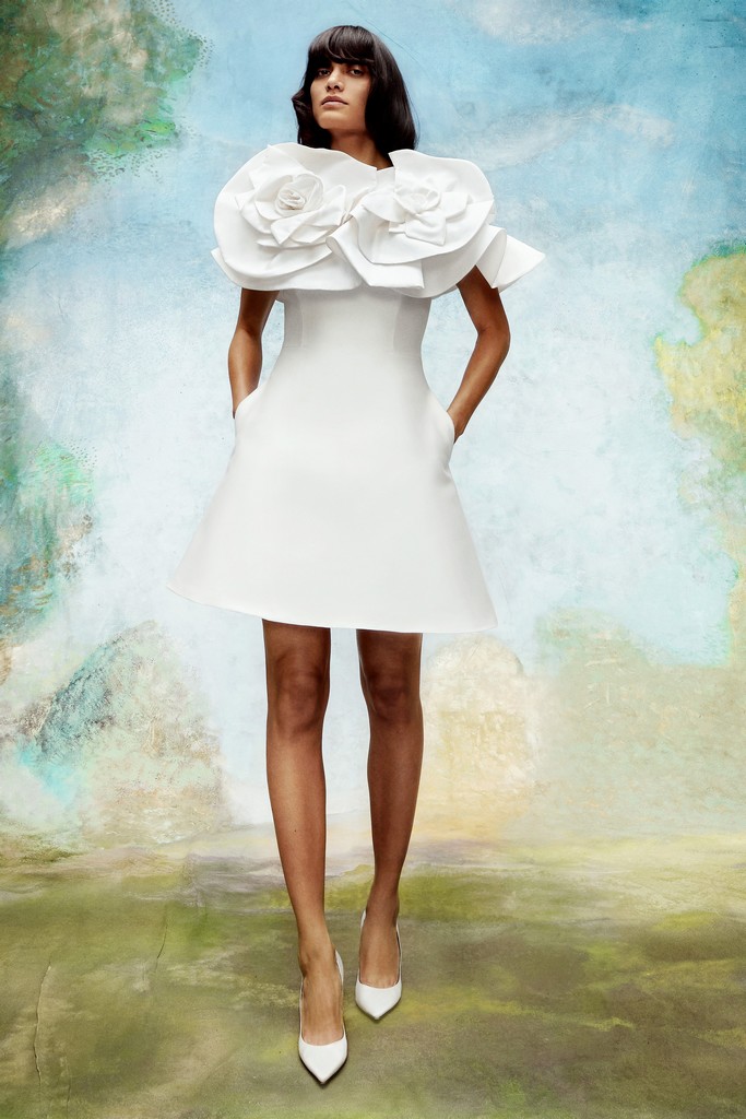 Outra forma de criar silhuetas inesperadas foi usar flores gigantes no decote, indo de ombro a ombro e dando volume à região.