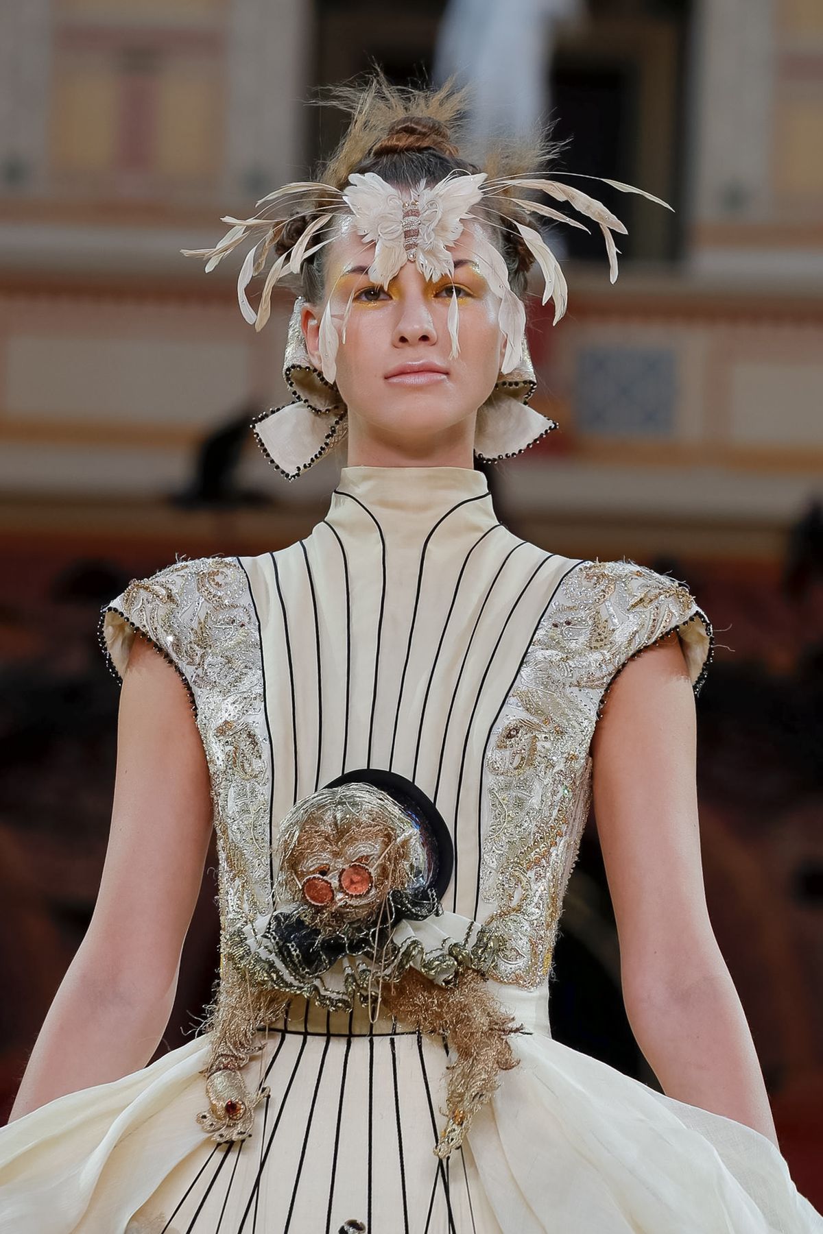 Entre penteados de ninho e acessórios de gaiola, uma maquiagem se destaca no desfile de Guo Pei. Uma borboleta com penas foi usada para complementar a beleza colorida da marca.