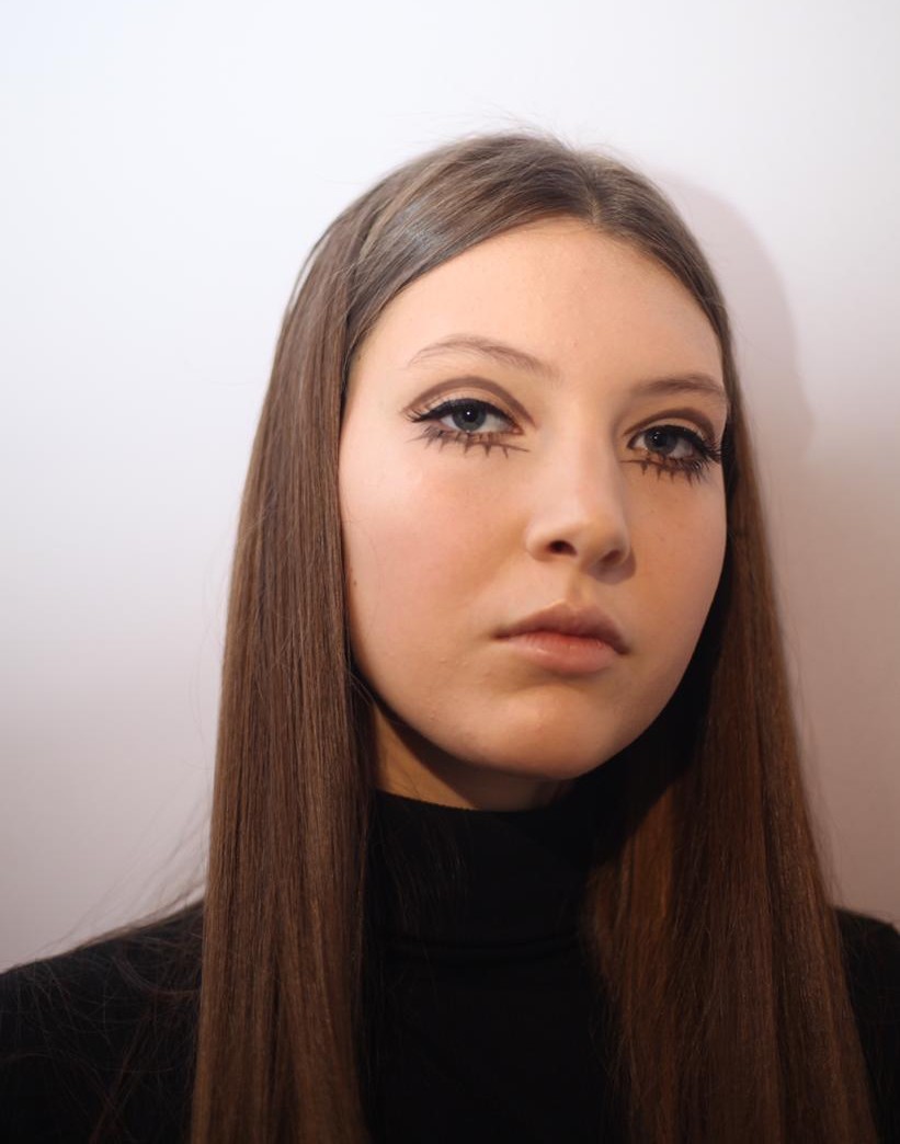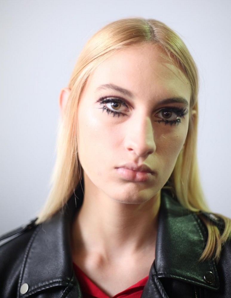 As modelos usaram cílios postiços na parte superior, e a inferior foi destacada com bastante máscara e um desenho feito com lápis imitando as pestanas. Para completar, um delineado grosso foi feito rente à linha d’água.