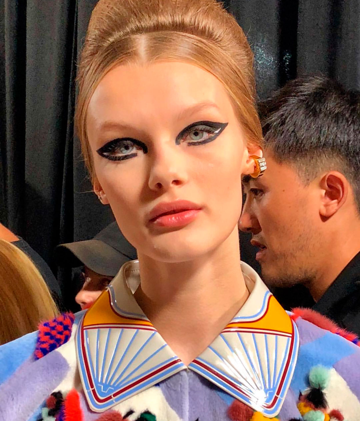 “A maquiagem da Fendi sempre vem com algo diferente e ousado. Para o próximo inverno, o make das modelos veio com foco nos olhos com um gatinho que vai além do côncavo, criando uma espécie de máscara ao redor das pálpebras, além do lápis branco na linha d’água que ultrapassa os olhos entre o delineador”, conta o especialista.