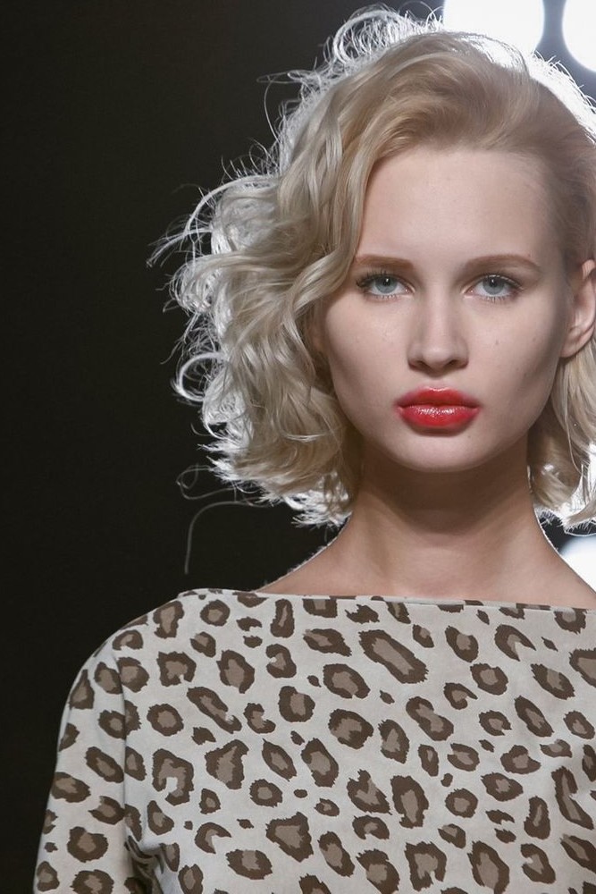 Com um tom de batom vermelho bem chamativo, a maquiagem ultrapassa os limites dos lábios. A cor fica forte nos centro da boca, mas vai clareando conforme passa pelas linhas dos lábios. O efeito borrado já foi tendência em 2018 e volta renovado pelo acabamento vinil do batom.