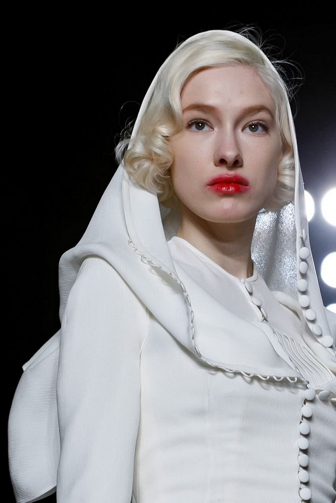 A grife Julien Fournié apresenta sua coleção verão 2019 de alta-costura, em Paris. Para acompanhar as peças desfiladas, a marca opta por uma beleza com enfoque nos lábios e retoma a tendência polêmica do batom borrado.
