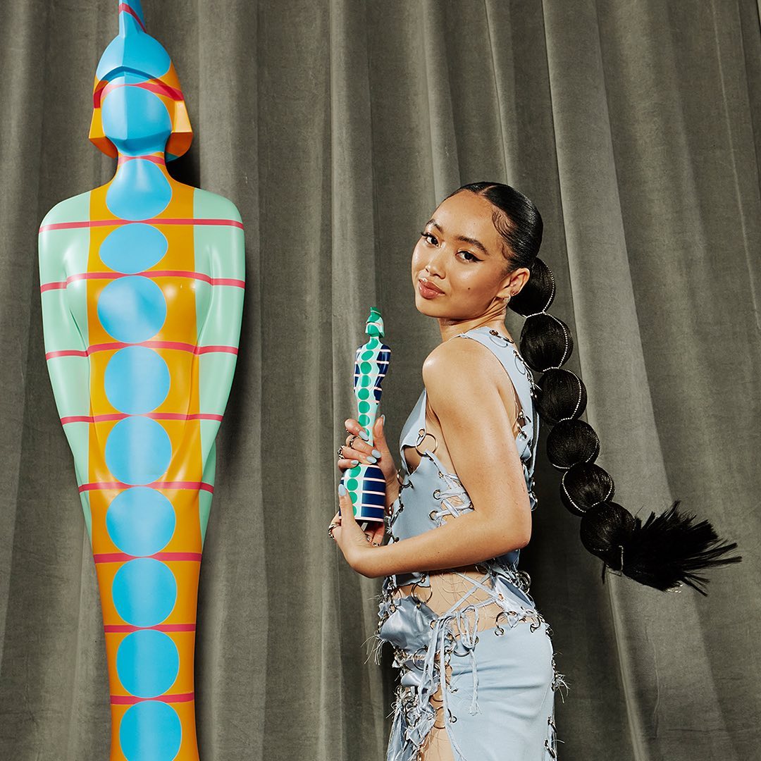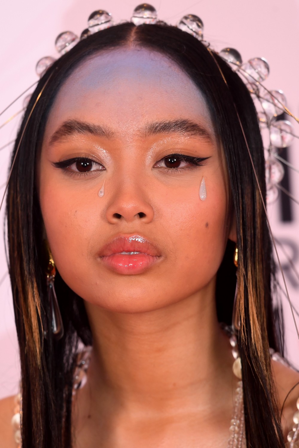 A novata Griffy encantou em dois momentos da noite. No tapete vermelho, a cantora optou por um visual mais surreal, com uma pintura em tons pastel, lágrimas e um véu de cristais complementando o delineado preto e glossy eyes. Durante a premiação, a artista optou por um lindo rabo de cavalo que formava formas arredondadas em seu comprimento, o chamado bubble ponytail.