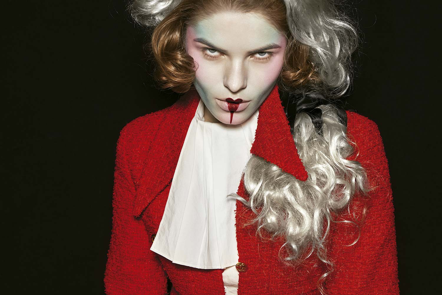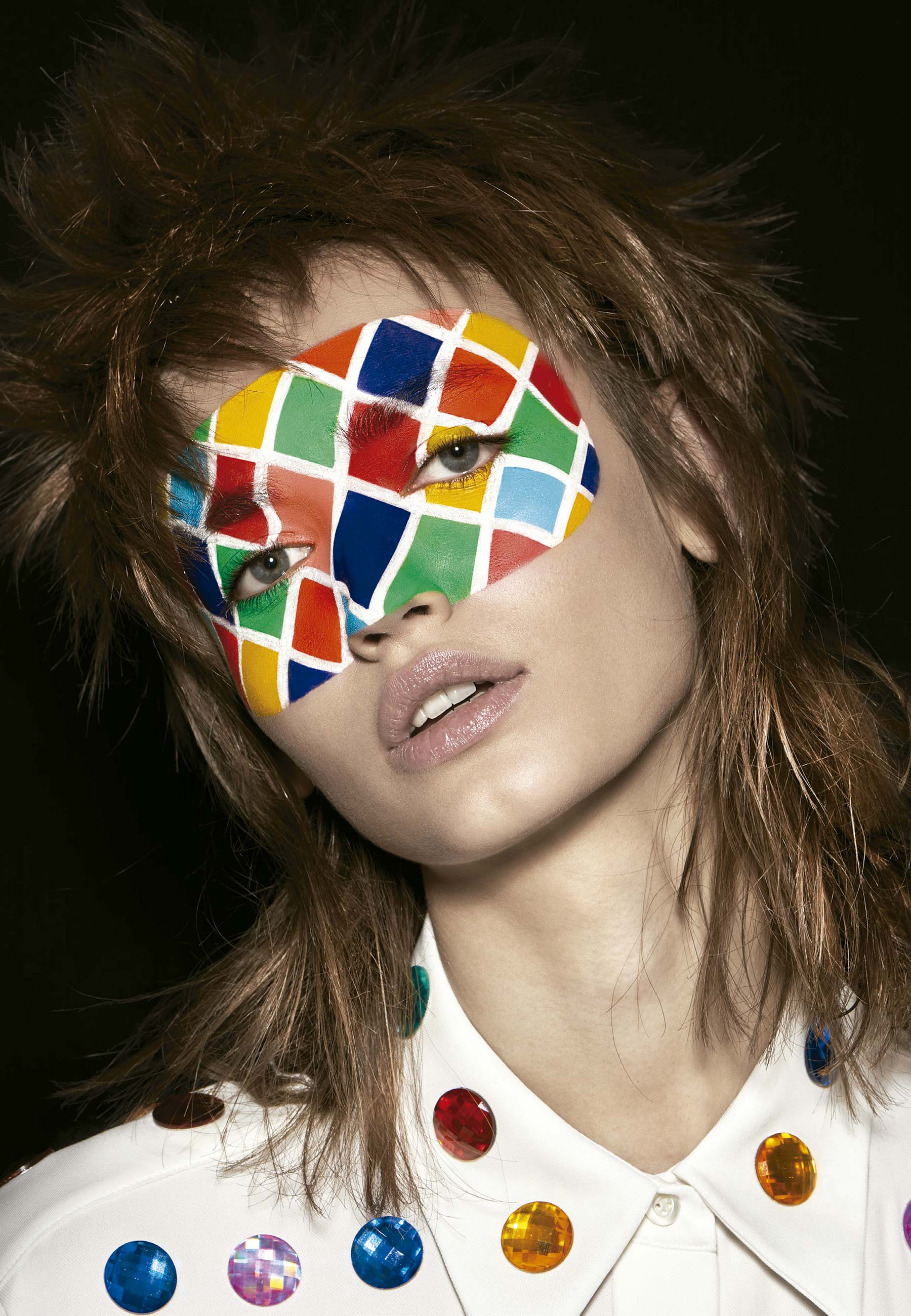 Beatrice Brusco (The Fabrica Milano) usa camisa Sara Battaglia e, na maquiagem, máscara feita com 12 Fards Gras Flash Color Case Make-Up For Ever Paris Professional; base Luminous Silk Foundation n.3; e lábios Him/Her Lipcare 01 e 06, ambos Giorgio Armani.
