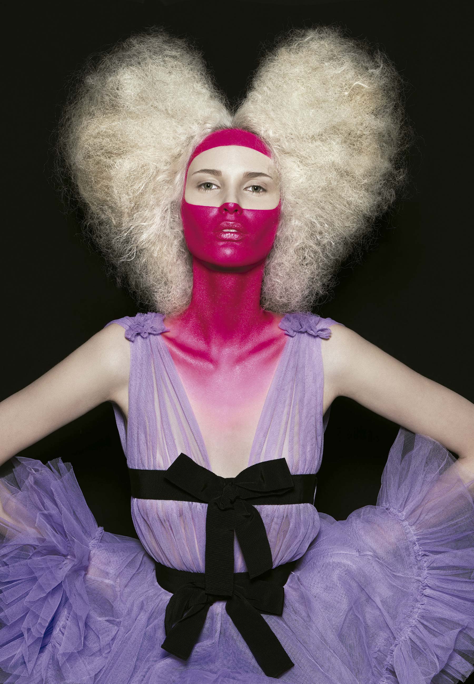 Arina Lush (The Fabrica Milano) usa vestido Brognano e, na maquiagem, máscara fúcsia feita com Lip Color 86 Electrique e acabamento