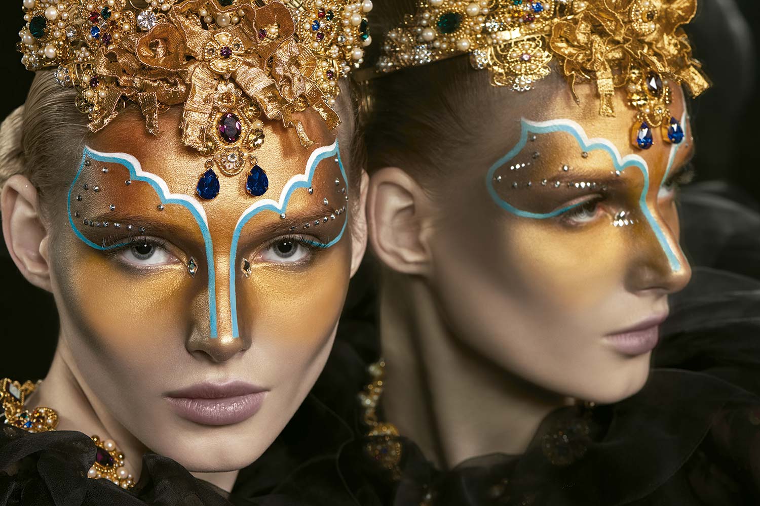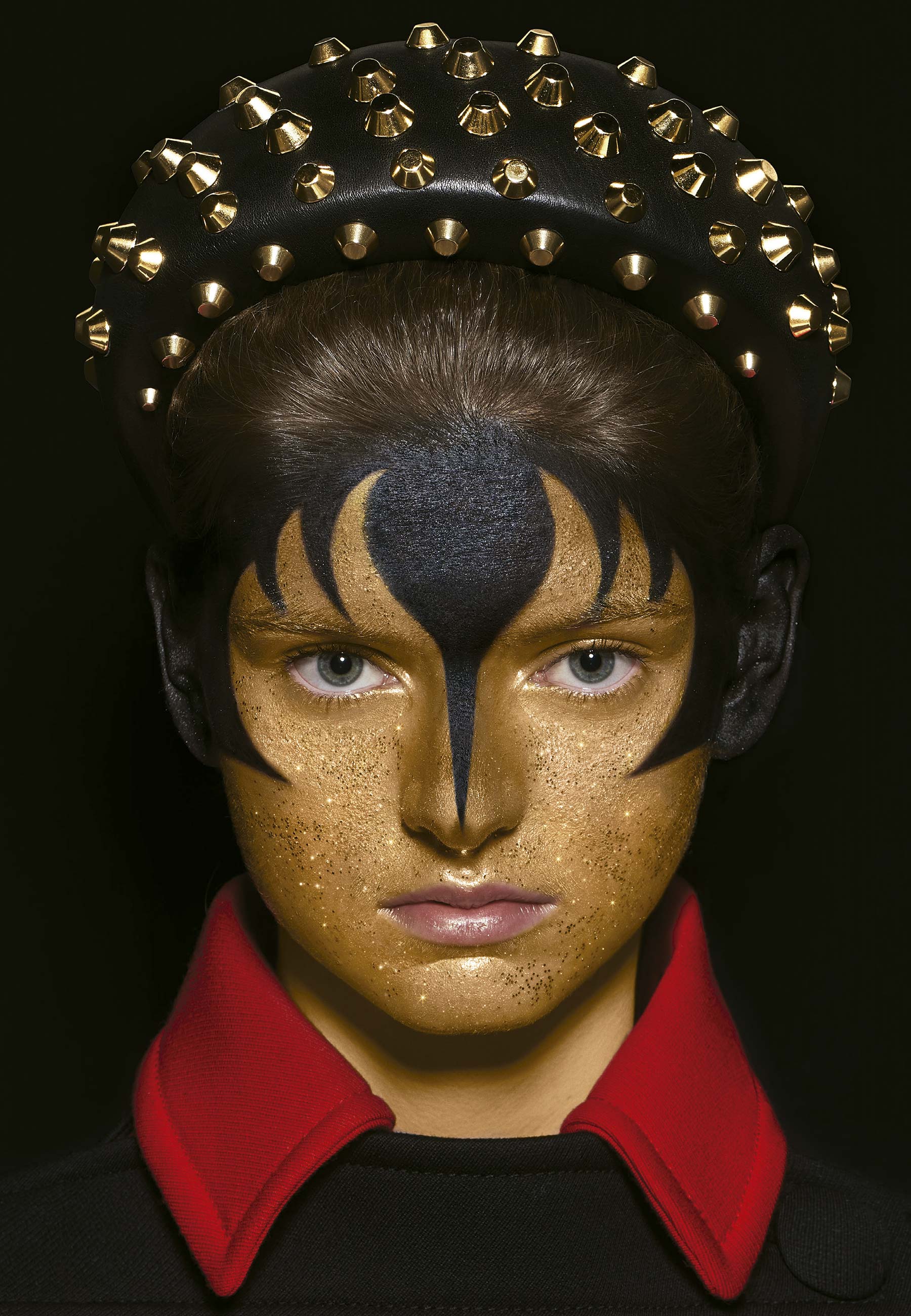Sandra Boiaryna (Elite Milano) usa look total Dolce & Gabbana e, na maquiagem, iluminadores Shimmering Skin Perfector Pressed Highlighter Gold Lava e Shimmering Skin Perfector Liquid Highligter nos tons Topaz e Rose Gold Becca; na parte escura, sombra Perfect Mono Eyeshadow Stromboli 130; e, nos lábios, gloss Sheer Shine Praline 102, ambos Dolce&Gabbana; make decorativo, 12 Fards Gras Flash Color Case, Make-Up For Ever Paris Professional; e cristais Swarovski.