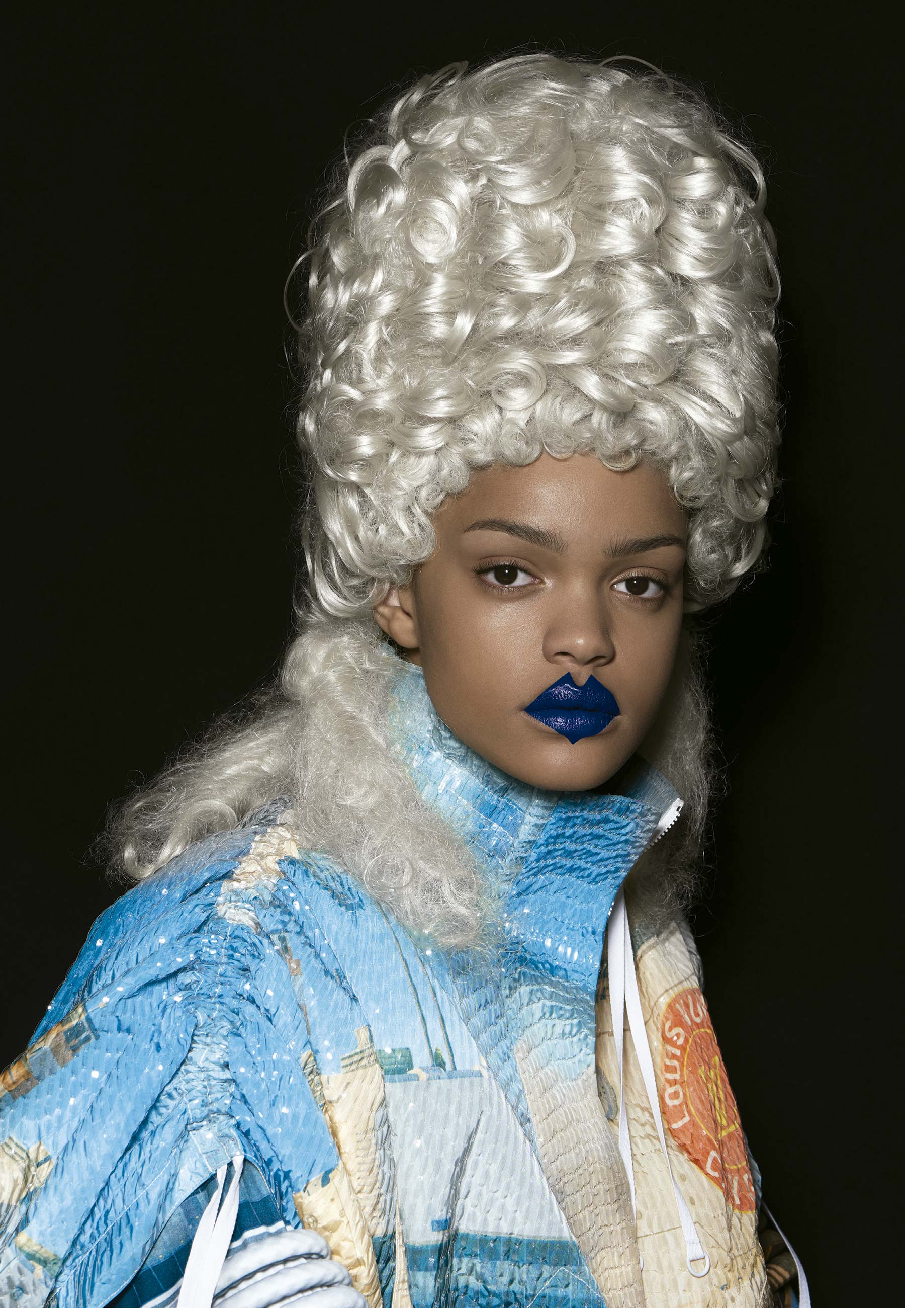 Carla Pereira (IMG Milano) usa look total Louis Vuitton e, na maquiagem, base Pro Filt’r Soft Matte Longwear n.350, lábios Mattemoiselle Clapback True Navy e gloss Goalz Universal Lip Luminizer 08, tudo Fenty Beauty.