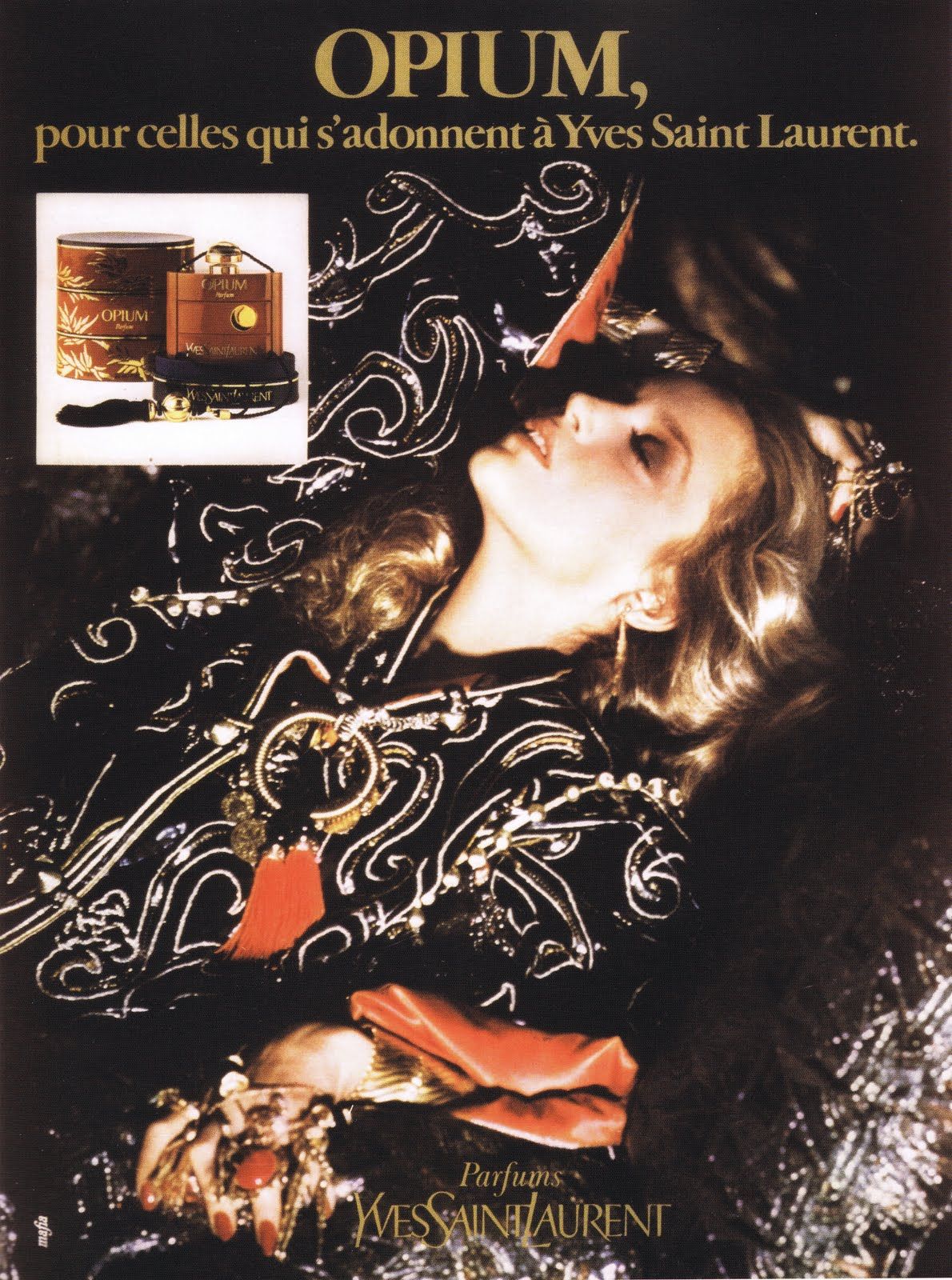 Opium: em 1977, Yves Saint Laurent lançou um perfume que combinaria com sua coleção de inverno do mesmo ano, que era inspirada na China. “Opium” surgiu como uma novidade excêntrica: a mistura de patchouli, myrrh e baunilha constroem as essência de uma das fragrâncias mais elegantes. E Saint Laurent foi quem decidiu o tipo de essências, do processo criativo do vidro do perfume até o press kit. E foi o próprio costureiro quem escolheu Jerry Hall para estrelar a campanha, que foi fotografada por Helmut Newton.