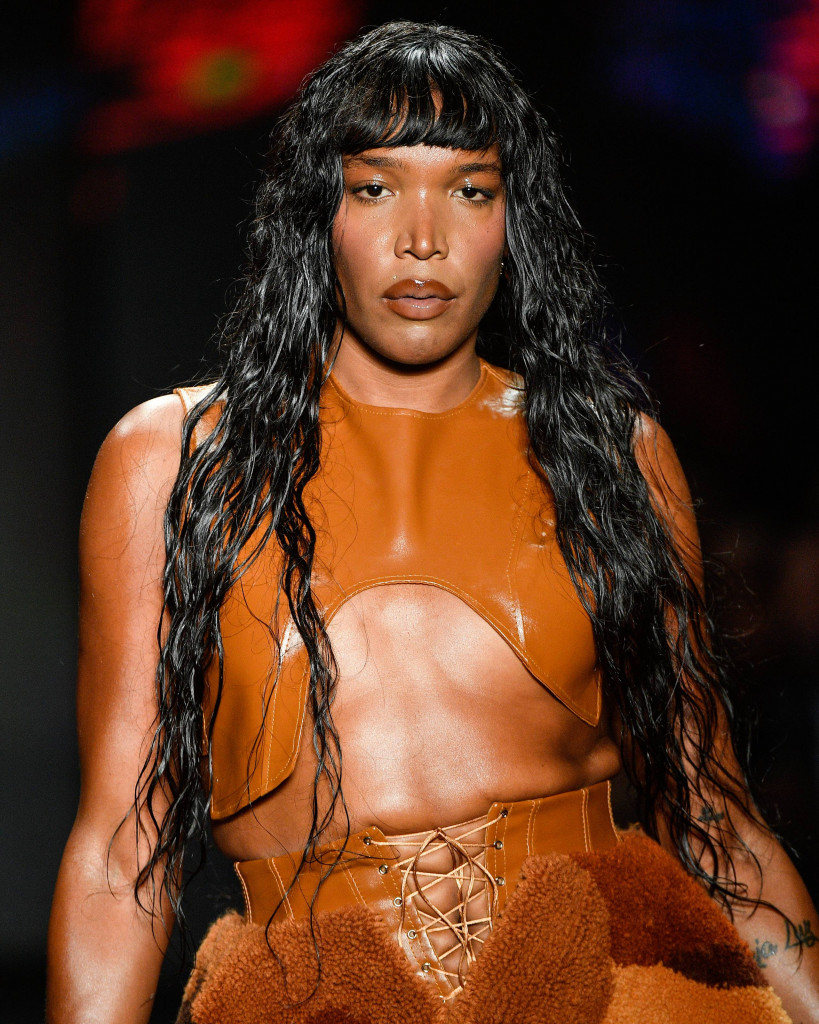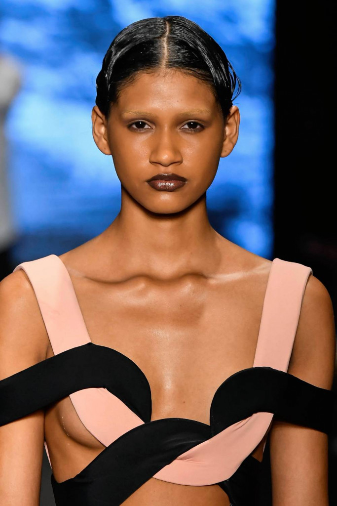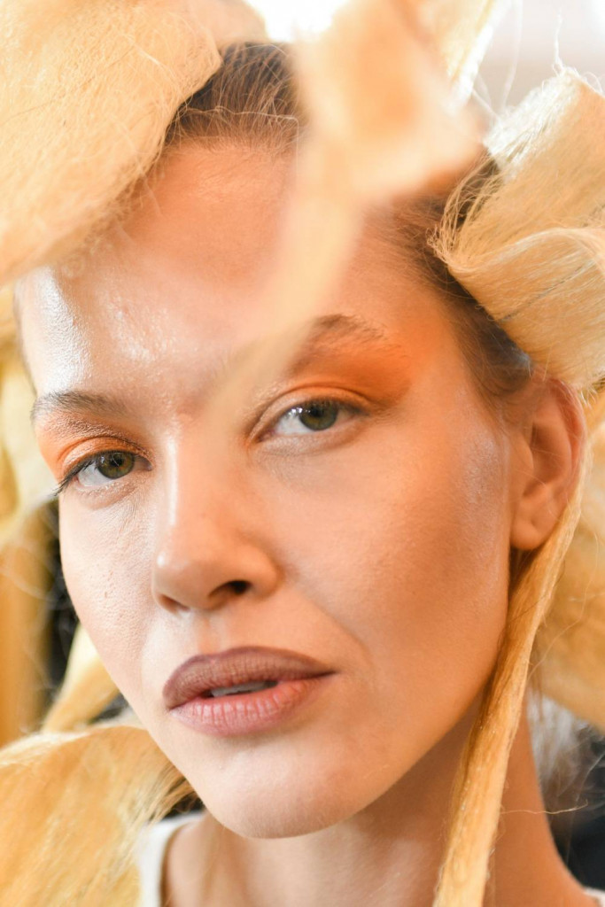 O outro visual que seguiu uma linha semelhante, com um resultado completamente diferente, foi a beleza assinada por Laura La Laina, no desfile de Marina Bitu. Para a ocasião, a beauty expert criou um degradê avermelhado, usando três tons alaranjados, remetendo à romã.