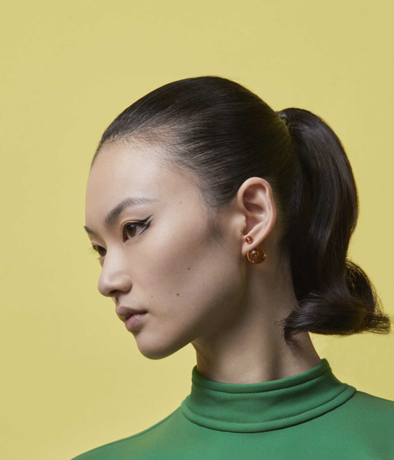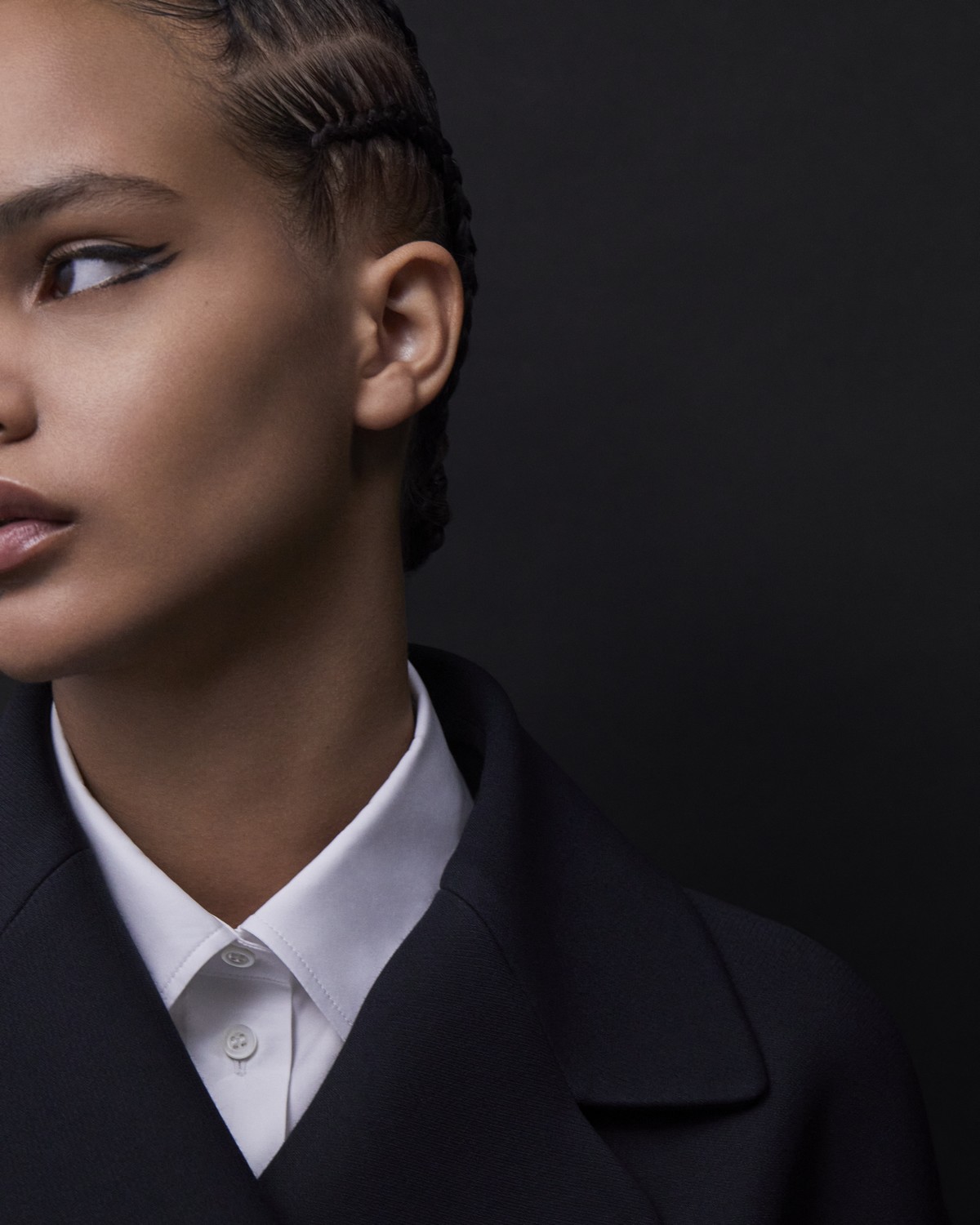 Os olhos foram alongados com uma linha dupla de delineado, criado com Dior Show Stage Liner 096 Vynil Black, na parte externa das pálpebras superiores e inferiores, alongando os cantos exteriores. Os traços foram separados por uma linha criada com o lápis Diorshow 529 beige Khol, harmonizando os dois delineados com a pele.