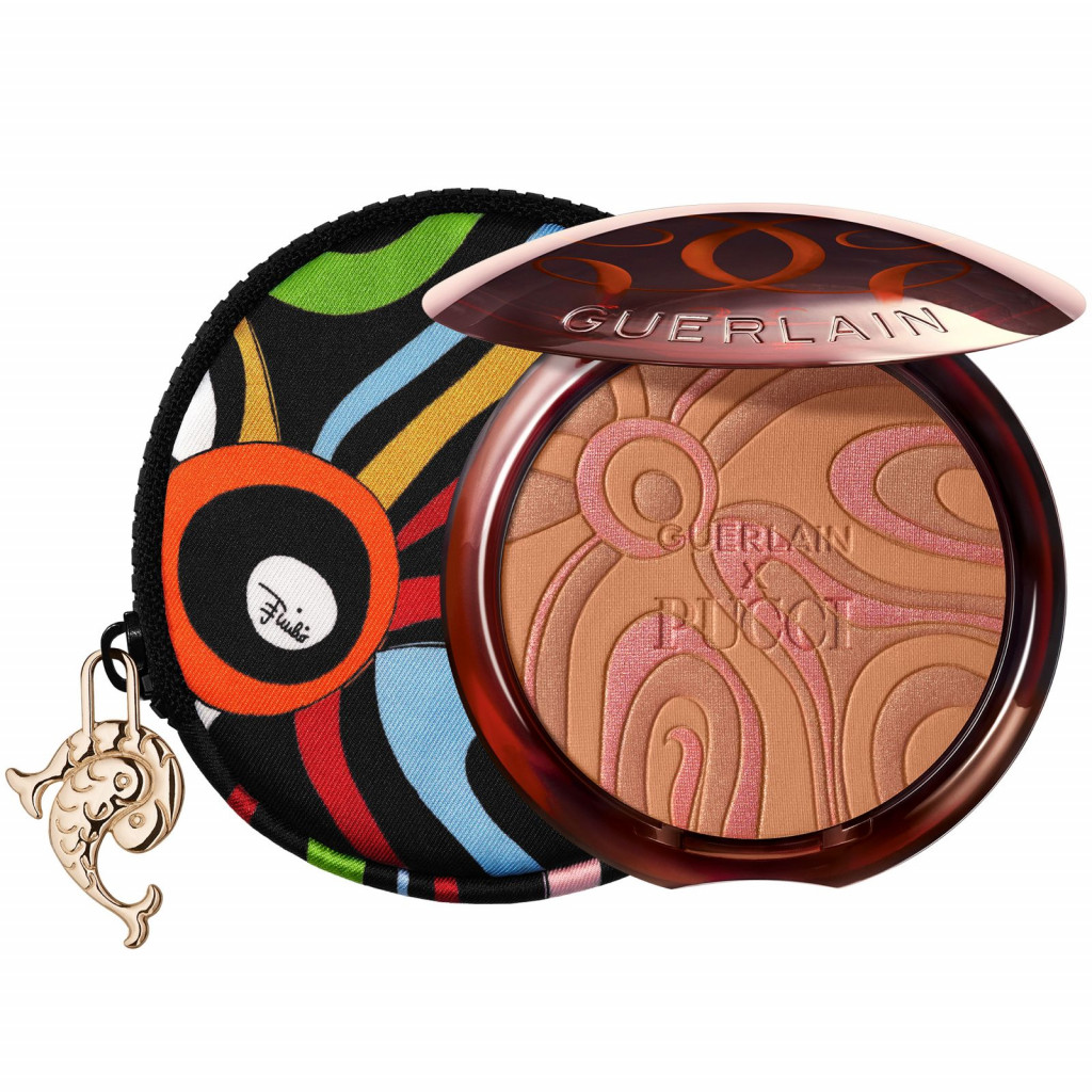 O que você acha do print Marmo adornando os itens da coleção, Camille? C: Eu realmente gosto desse print psicodélico, e adoro a forma como ele surgiu. Emilio Pucci amava passar tempo em Capri, e um dia, dentro da famosa Grotta Azzurra, viu o sol refletido na água, esboçando espirais sublimes. Ele então teve a ideia de desenhar esse print Marmo. Quando eu o vi nos arquivos, quis agarrá-lo e torná-lo meu. V: É deslumbrante! Os produtos icônicos da Guerlain adornados com esse padrão são absolutamente lindos. Eu adoro o nécessaire redondo com zíper para o Terracotta Marmo Sun, com seu tassel dourado que replica os dois peixes entrelaçados no logo da Pucci. E o pincel com seu lindo estojo de tecido…