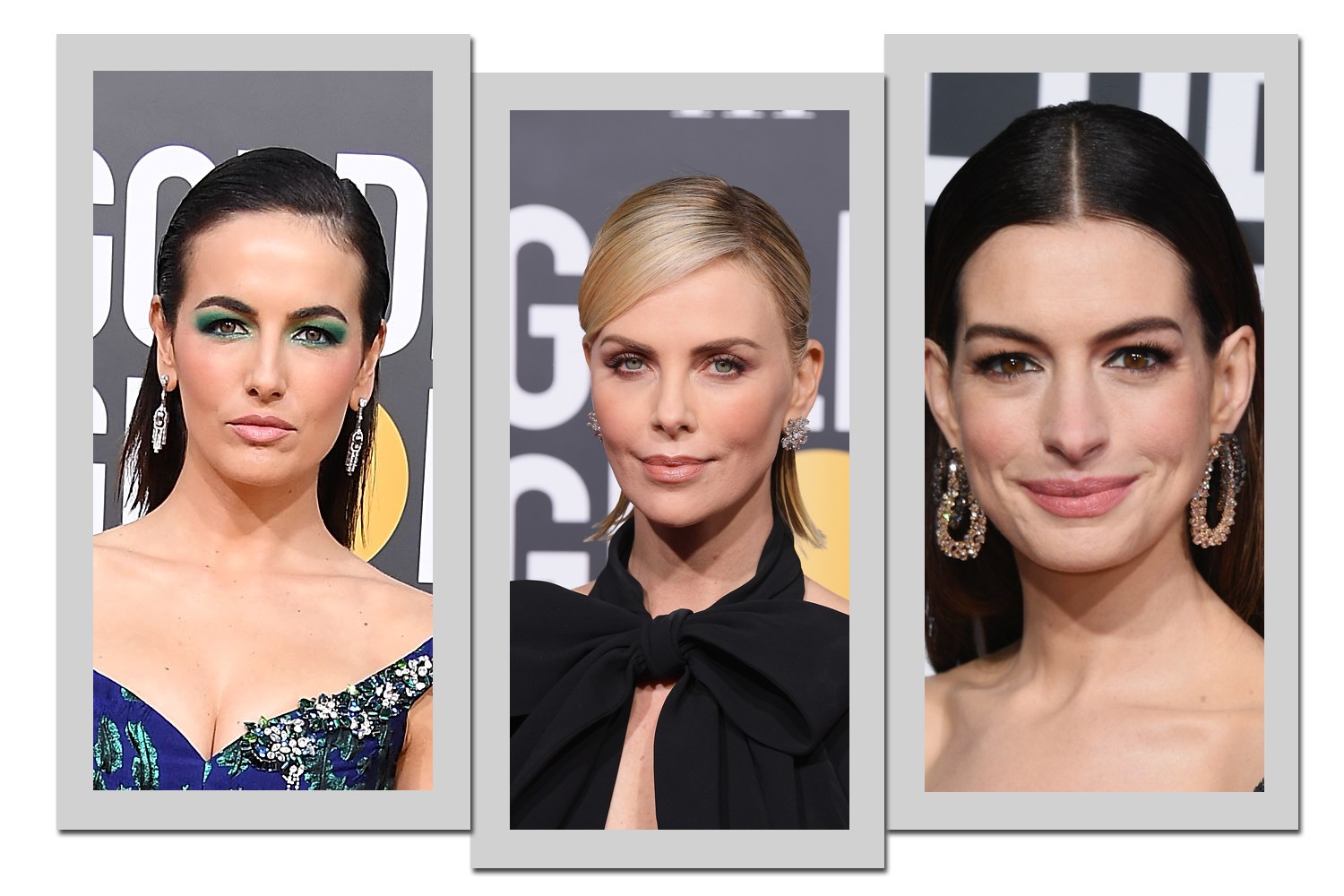 Charlize Theron, Camilla Belle e Anne Hathaway optaram por usar o cabelo solto. Fossem totalmente puxado para trás, repartidos ao meio ou de lado, os fios foram alisados e todo o volume foi retirado.