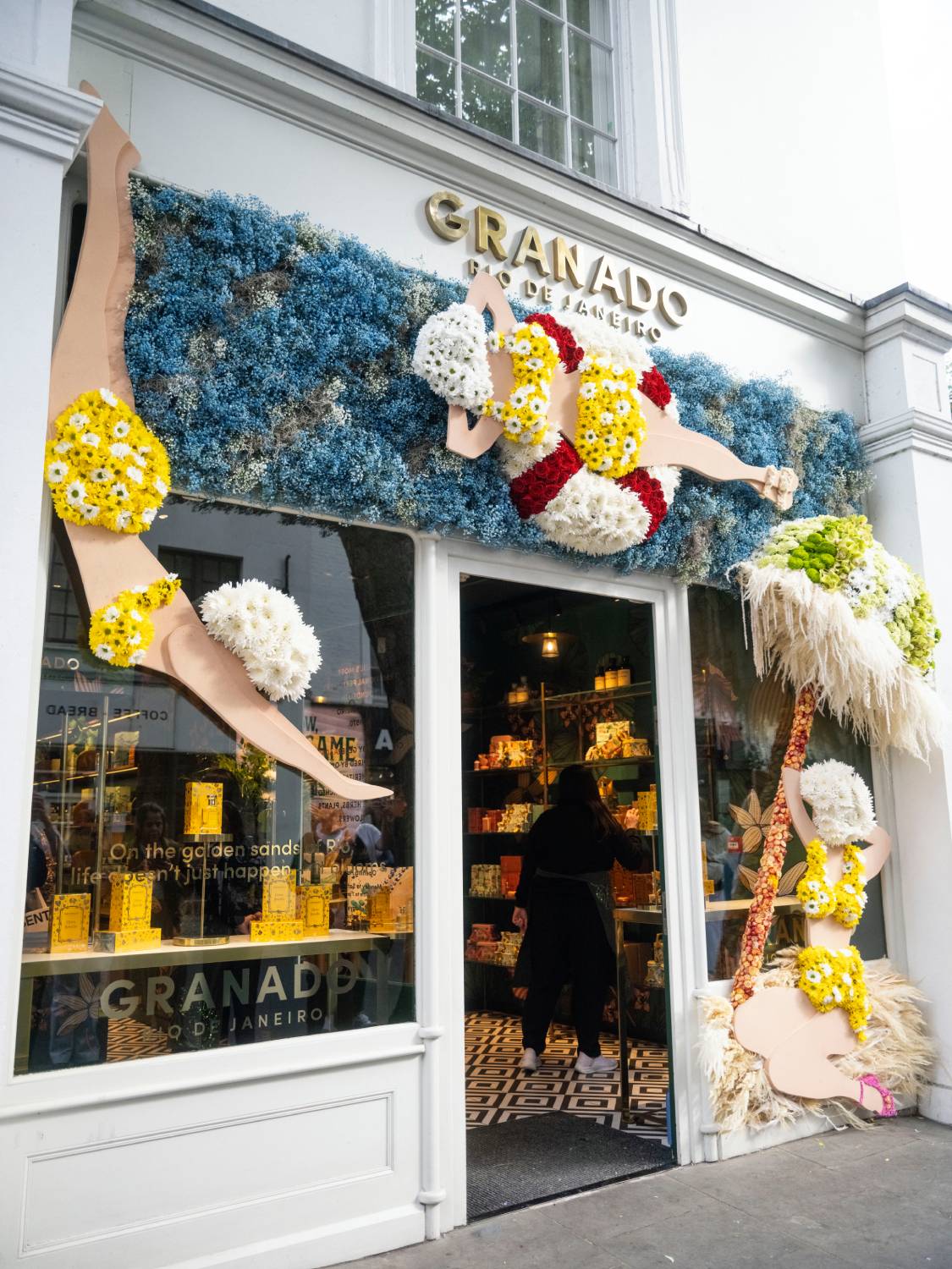 Inspirada na fragrância Citrus Brasilis, assinada pelo renomado perfumista Quentin Bisch, a instalação transforma a fachada da loja da Granado em Chelsea em um verdadeiro cartão-postal tropical — com cores cítricas, referências às pin-ups dos anos 1960 e uma brisa olfativa composta por notas de bergamota, mandarina, limão e kumquat.